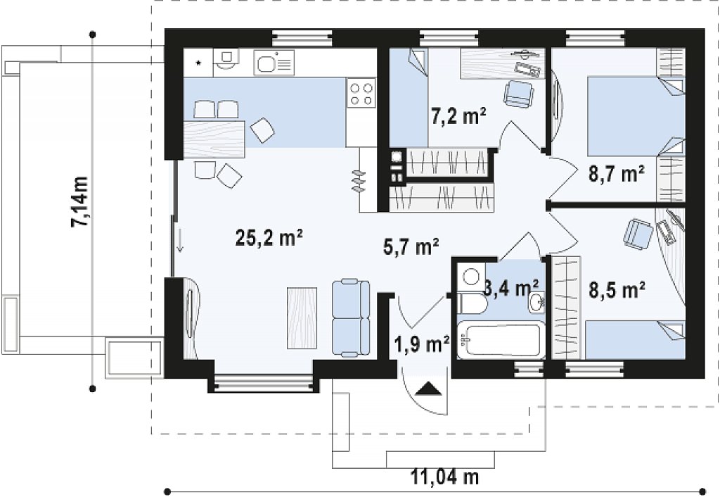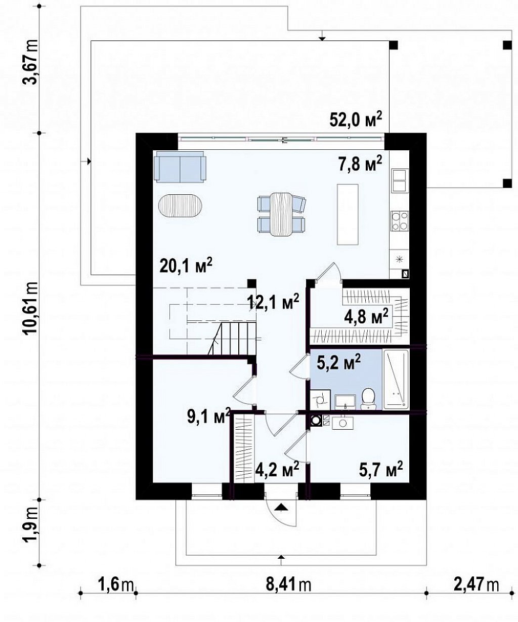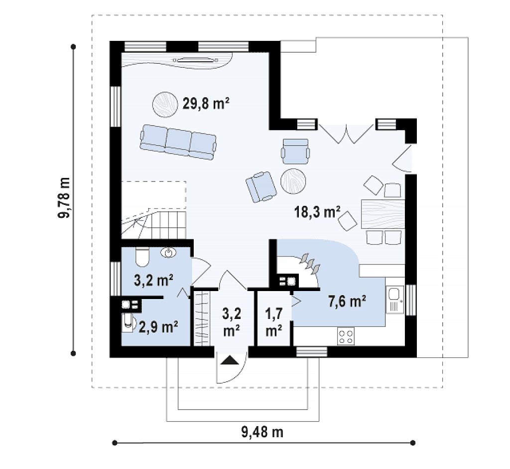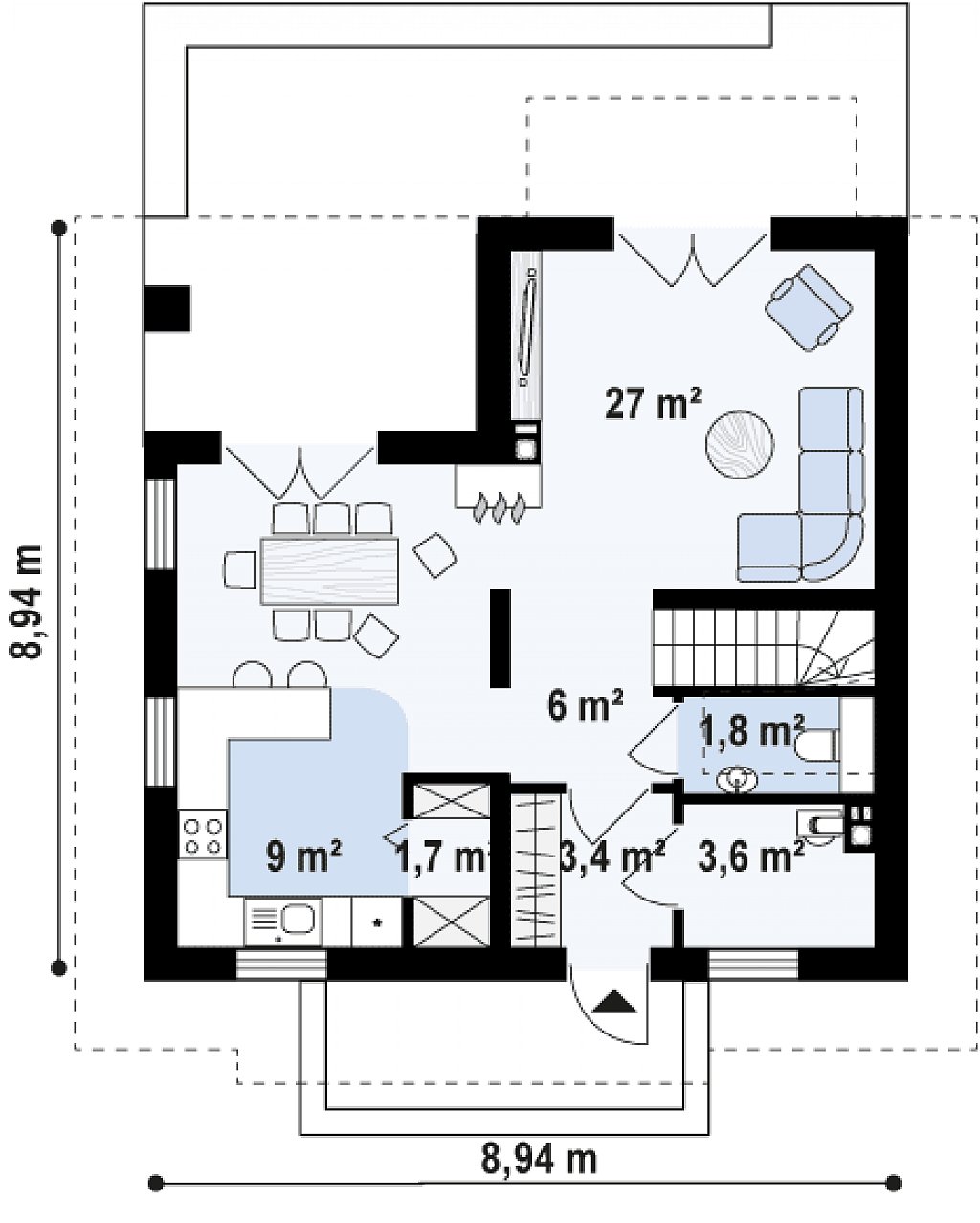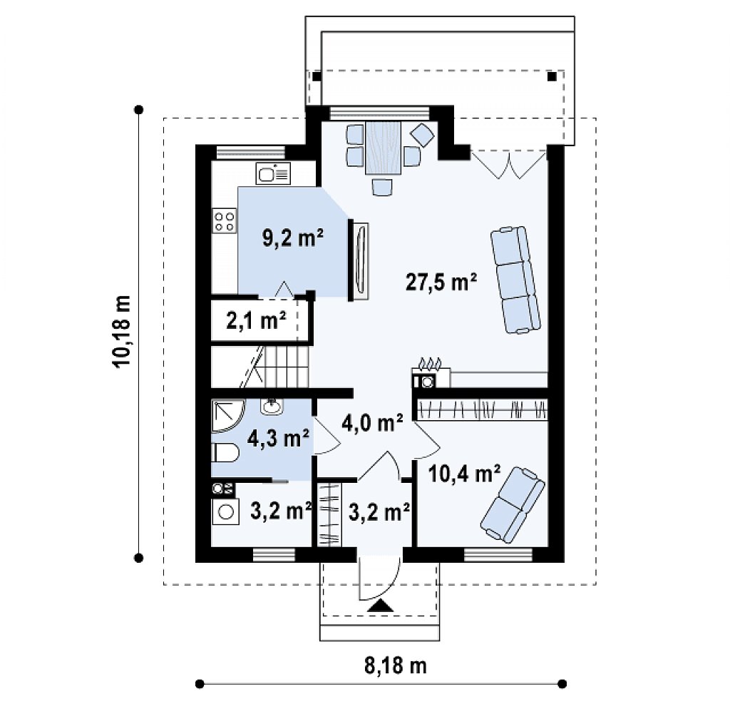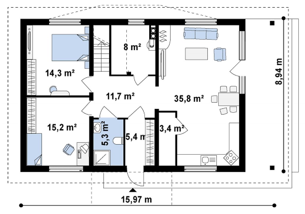 Проект разработан для тех, кто заинтересован в бюджетном и функциональном доме. Это компактное жильё, в котором каждая деталь подчинена комфорту.