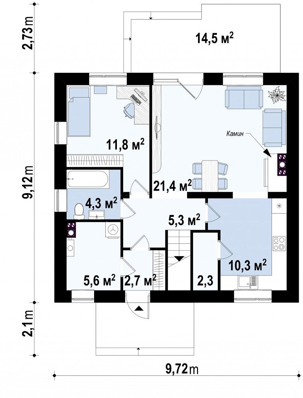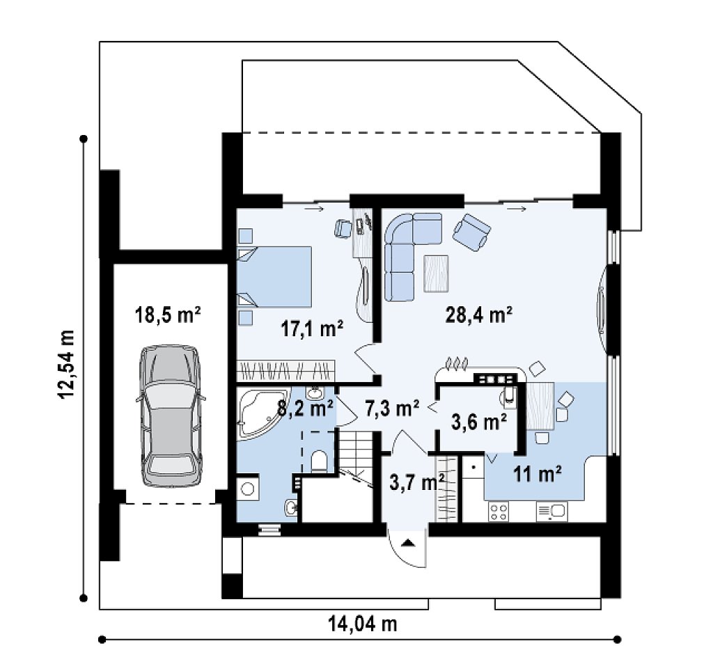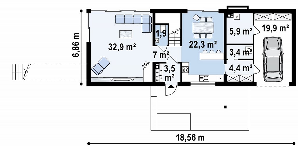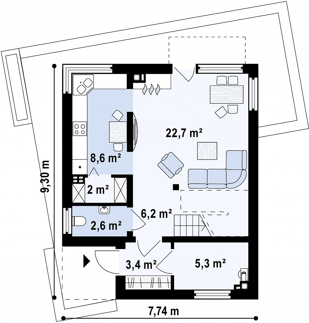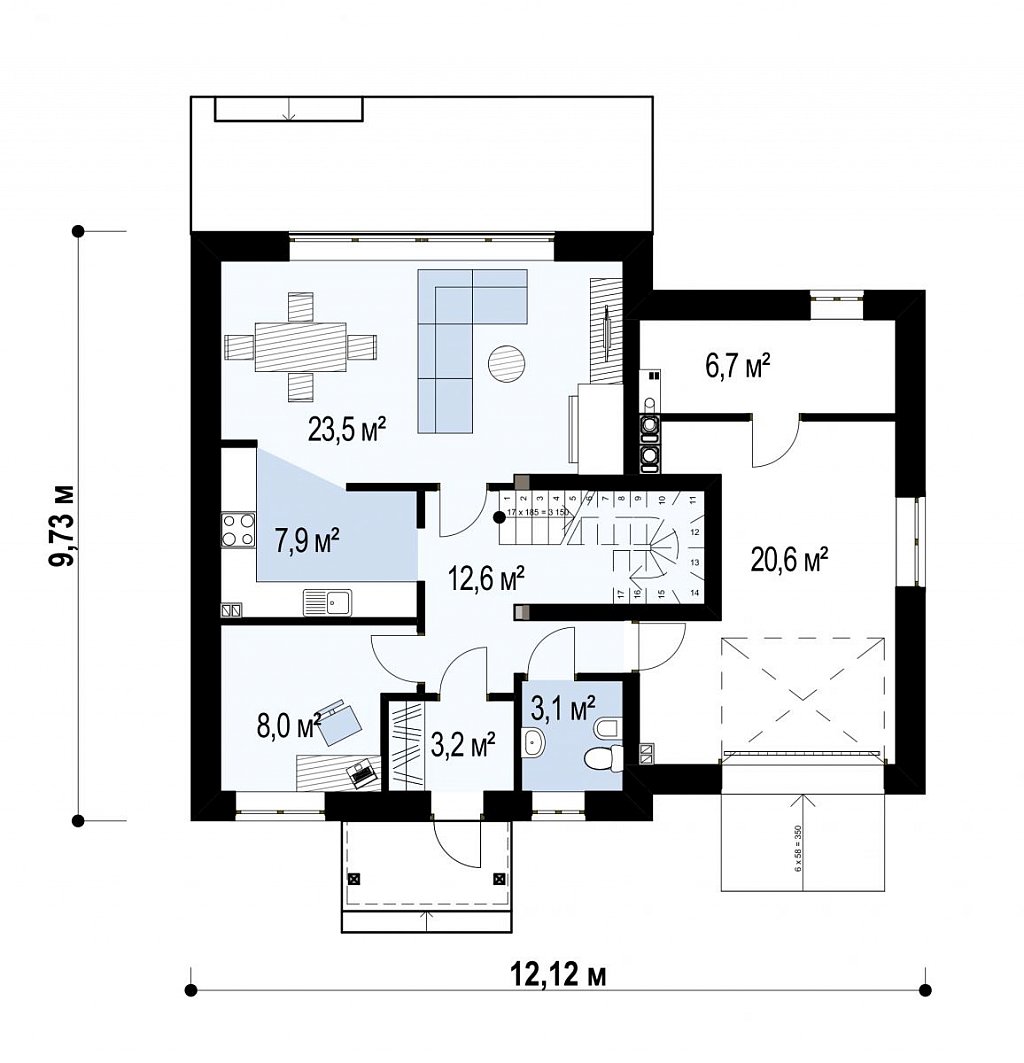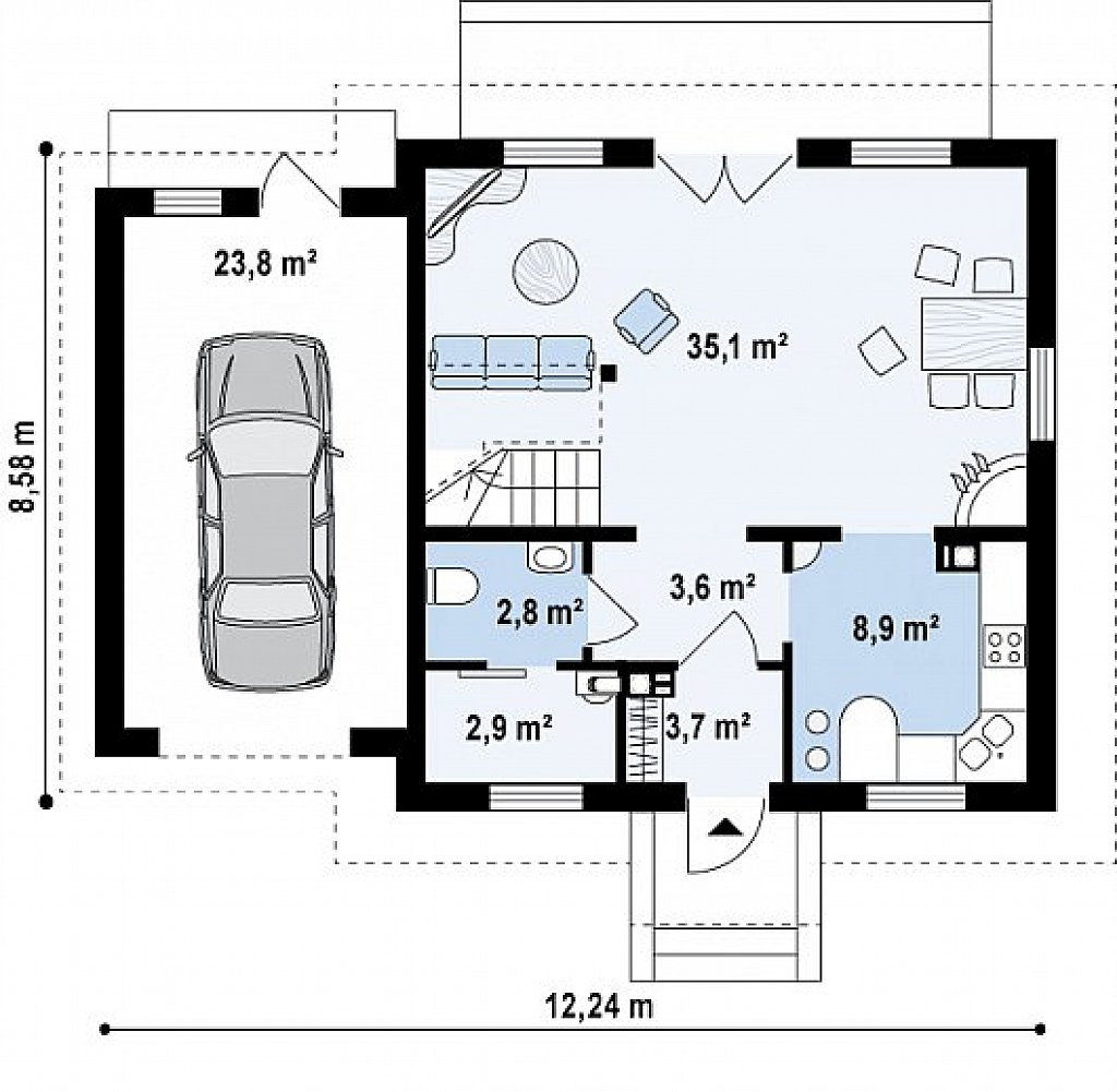 Проект разработан для тех, кто заинтересован в бюджетном и функциональном доме. Это компактное жильё, в котором каждая деталь подчинена комфорту.