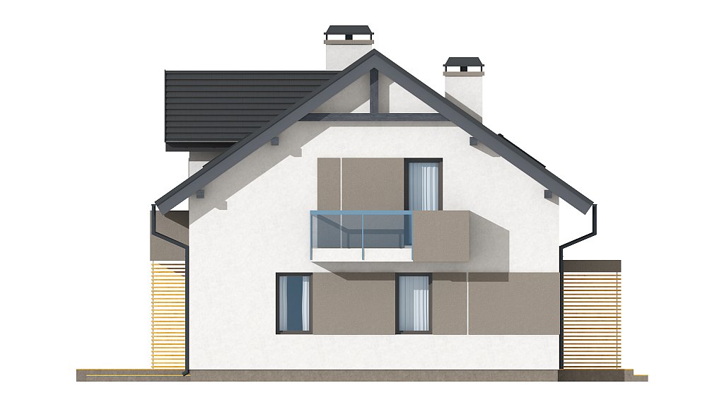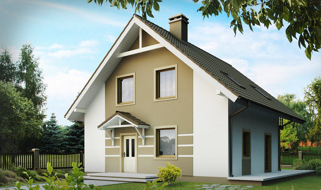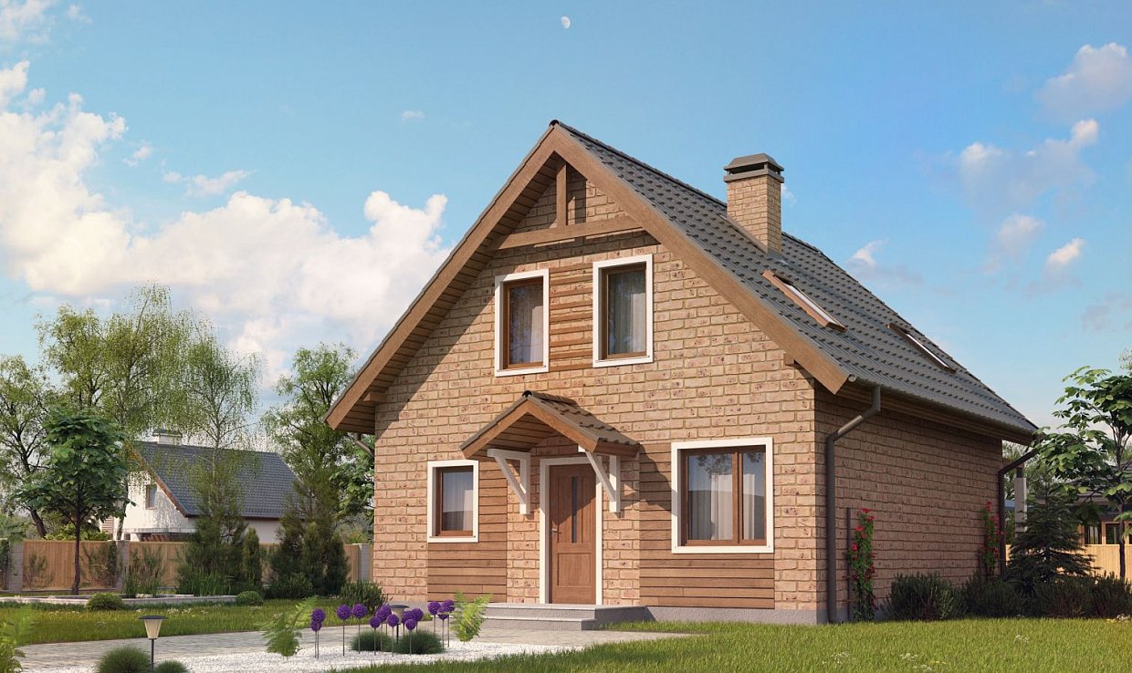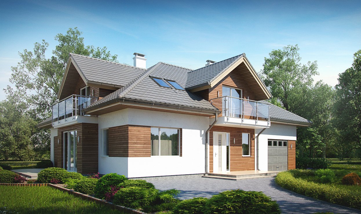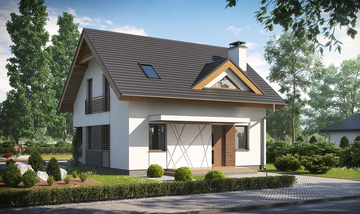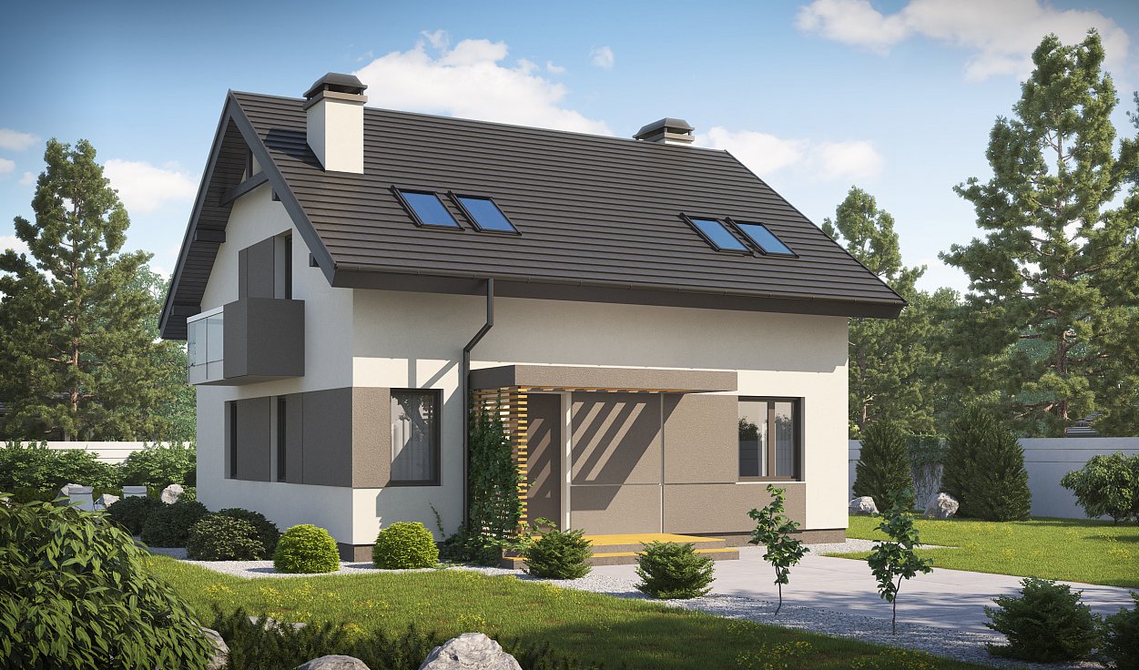 Проект практичного функционального дома современной отделкой фасада и дополнительной гостинной на мансарде.