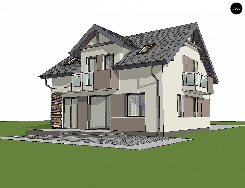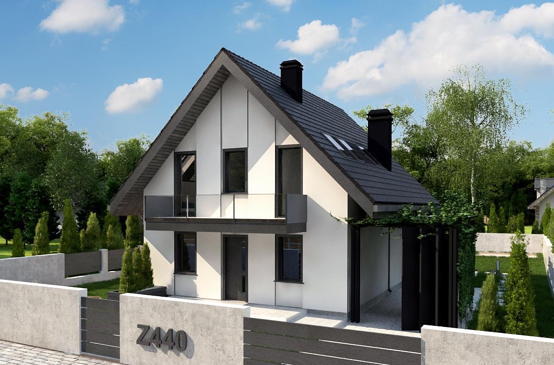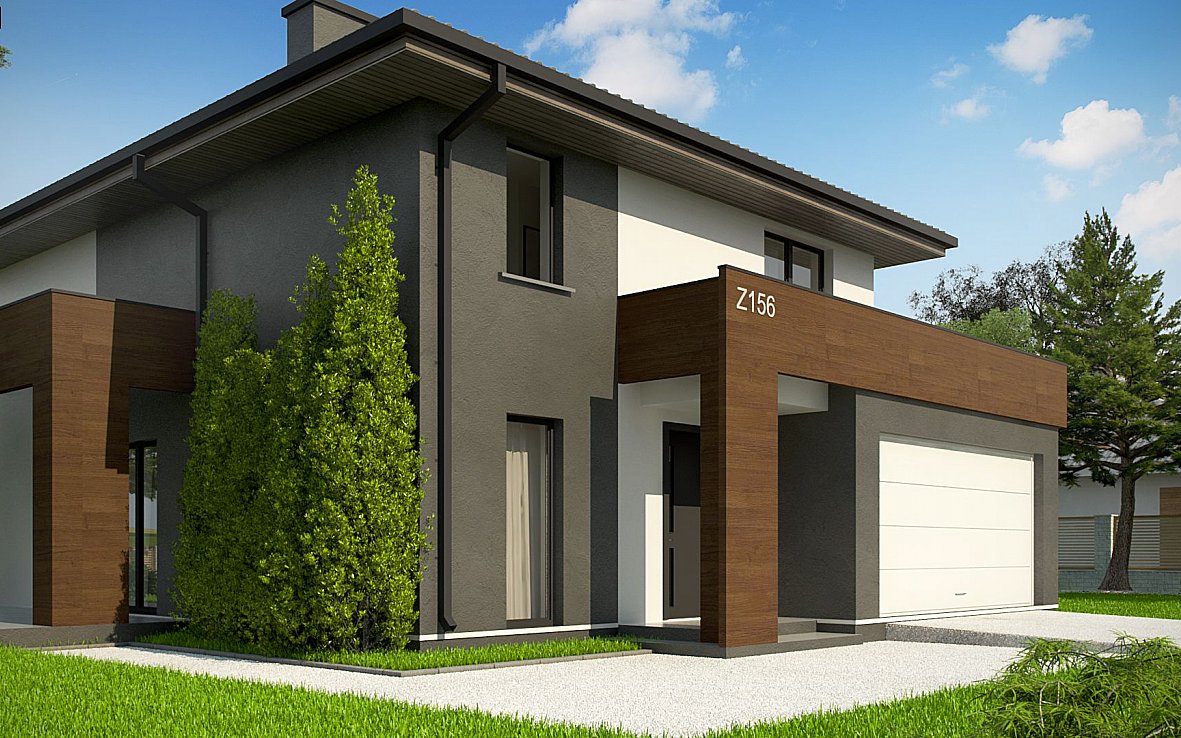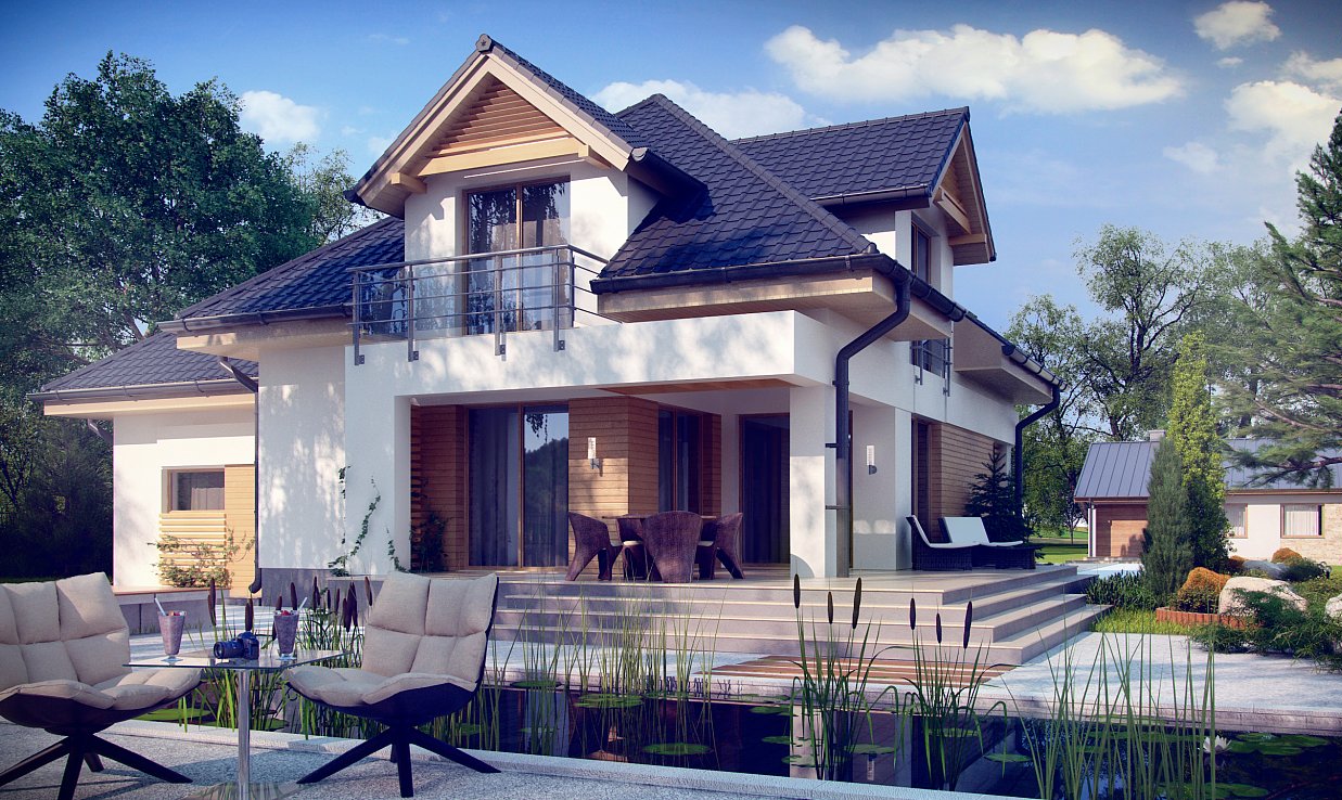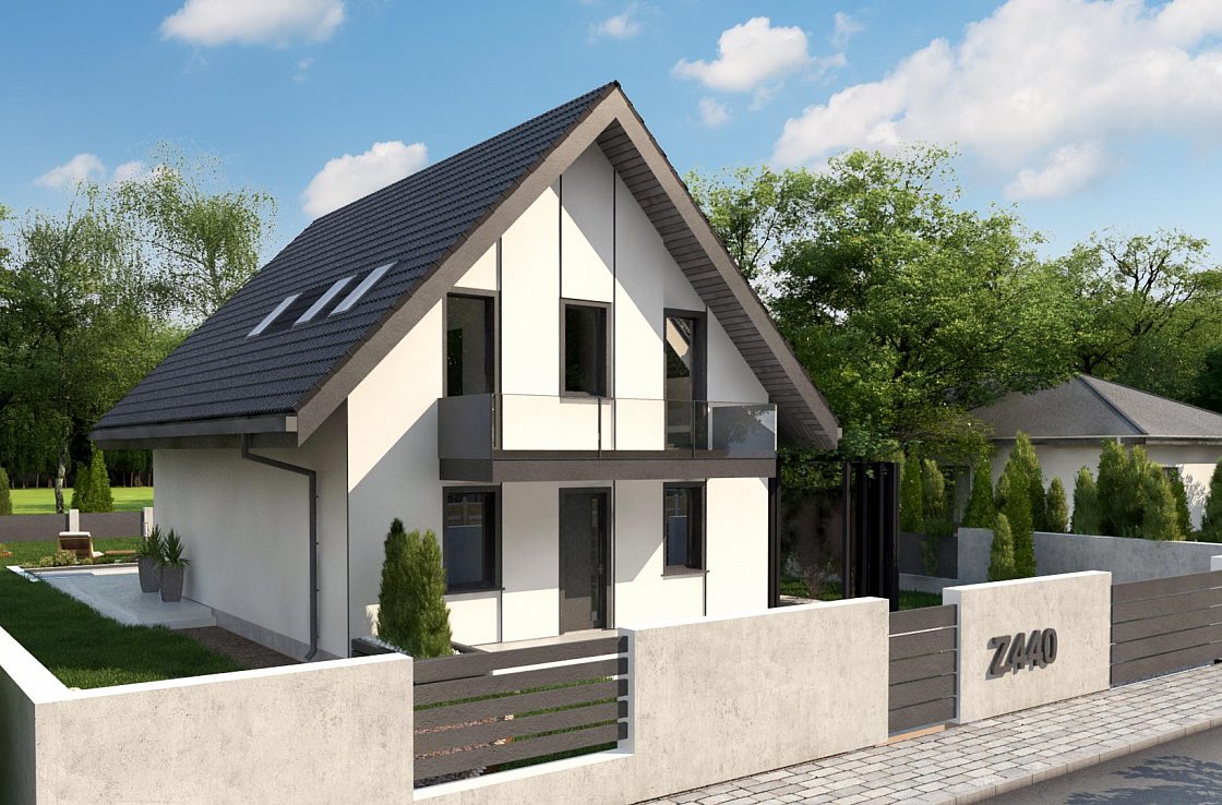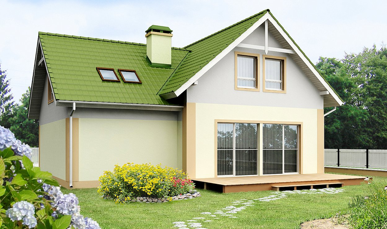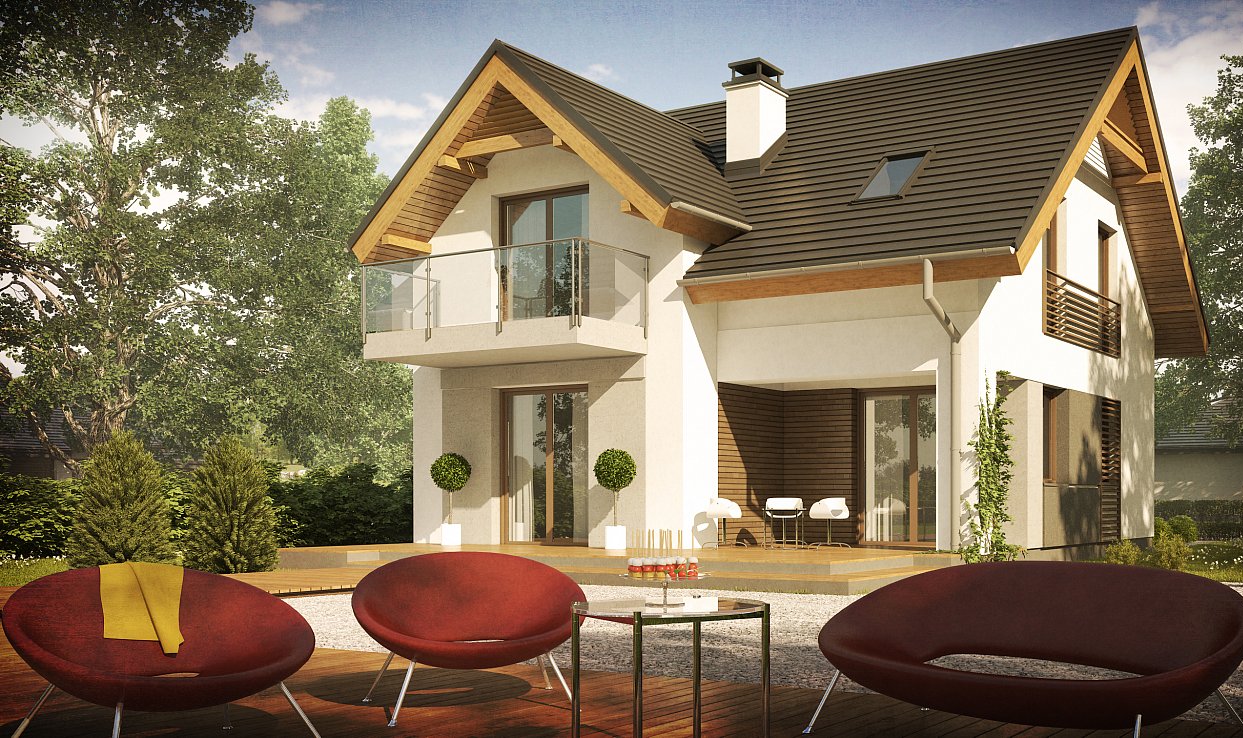 Проект практичного функционального дома современной отделкой фасада и дополнительной гостинной на мансарде.