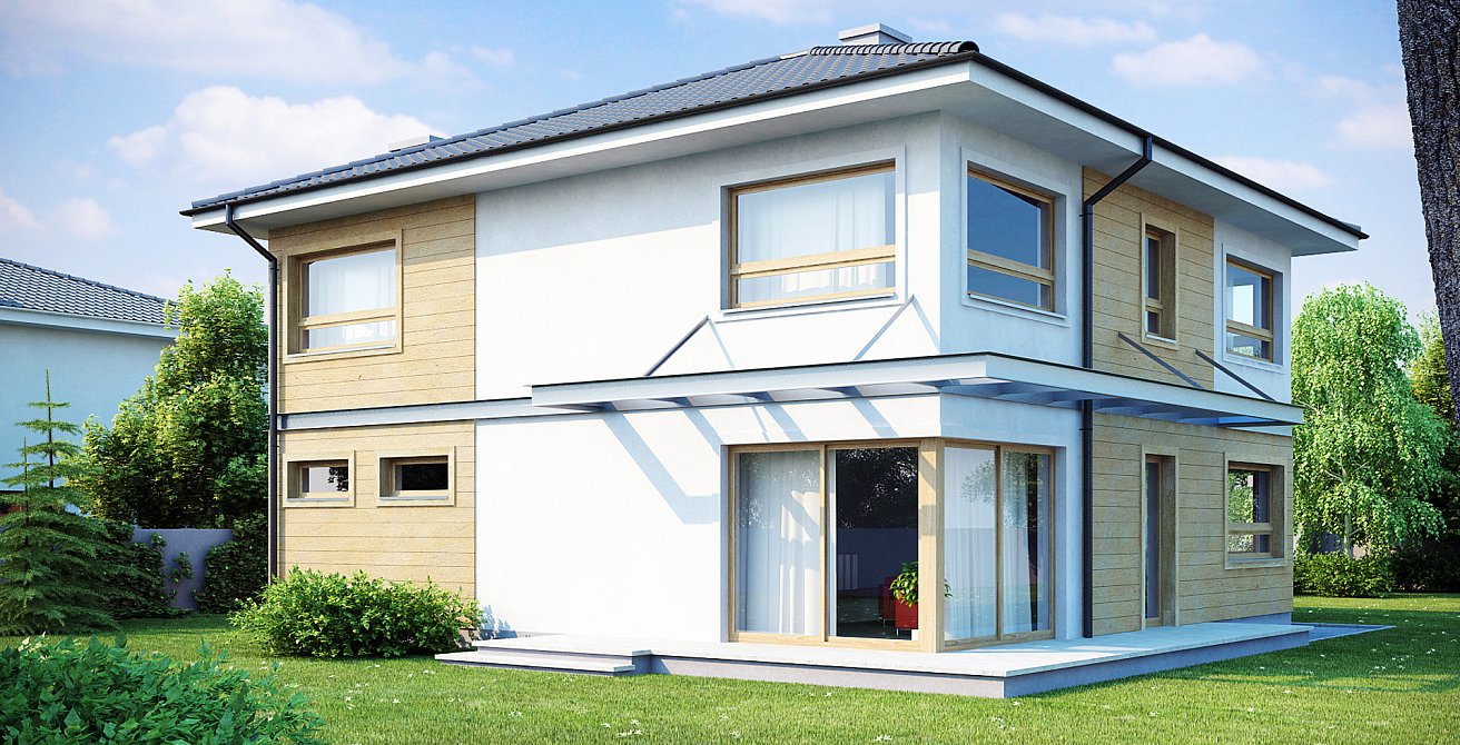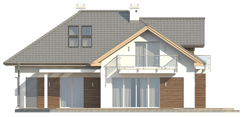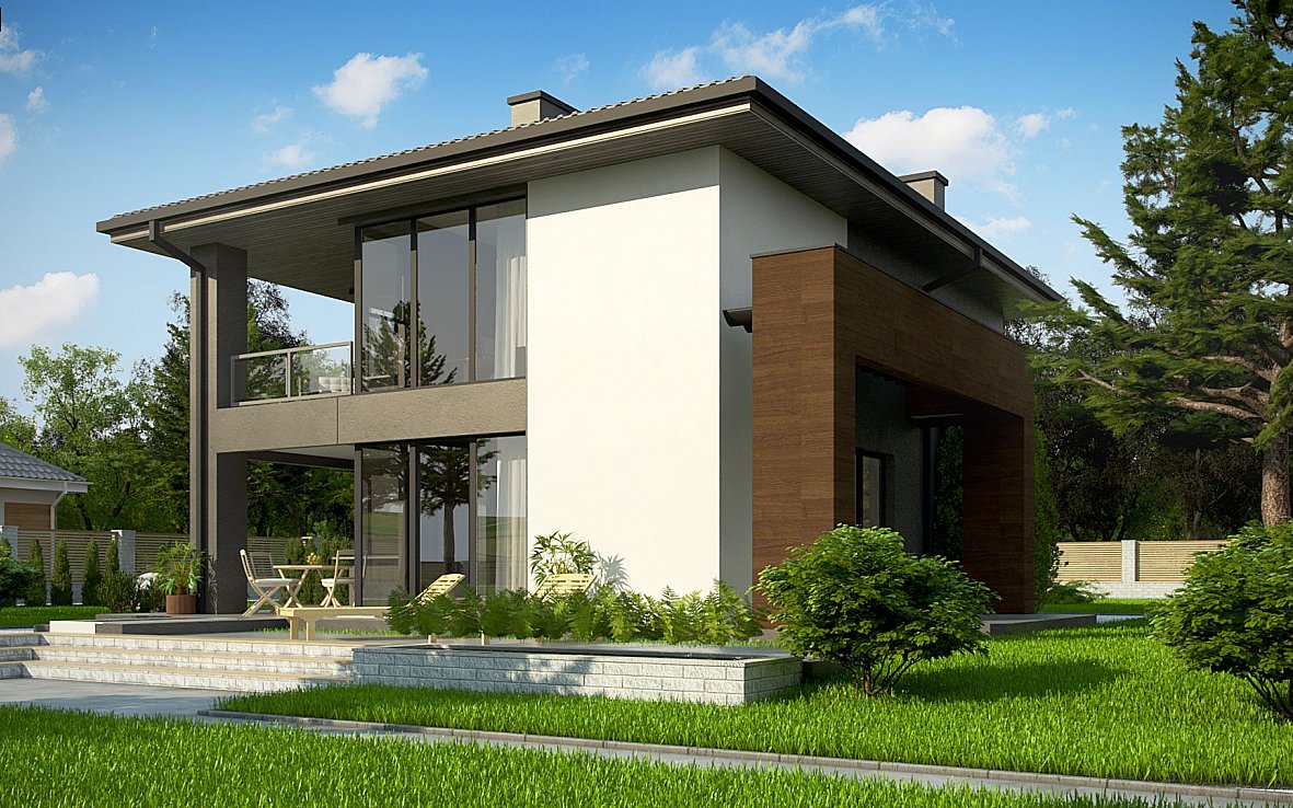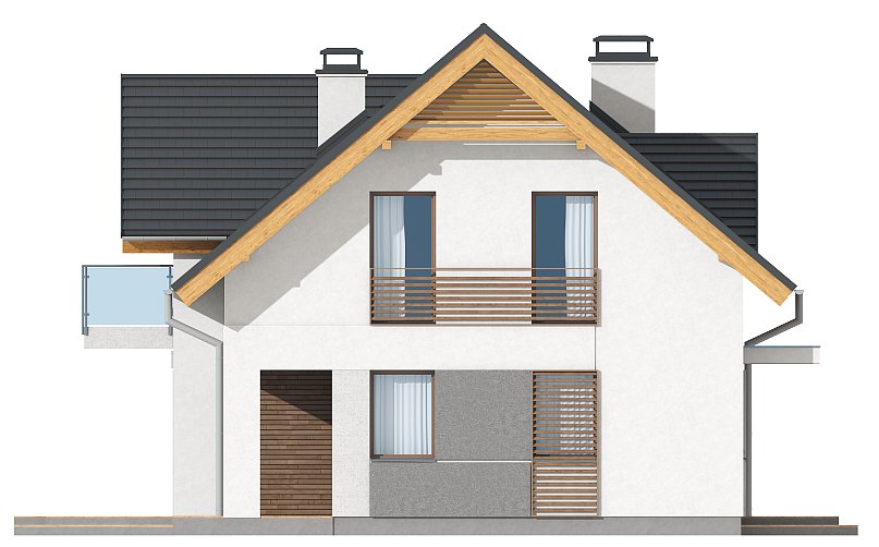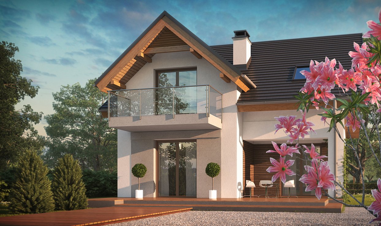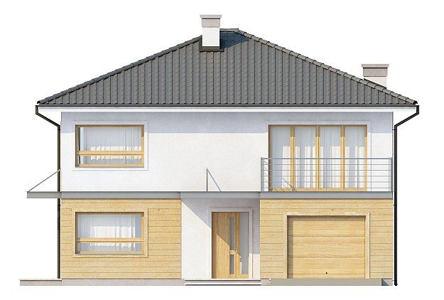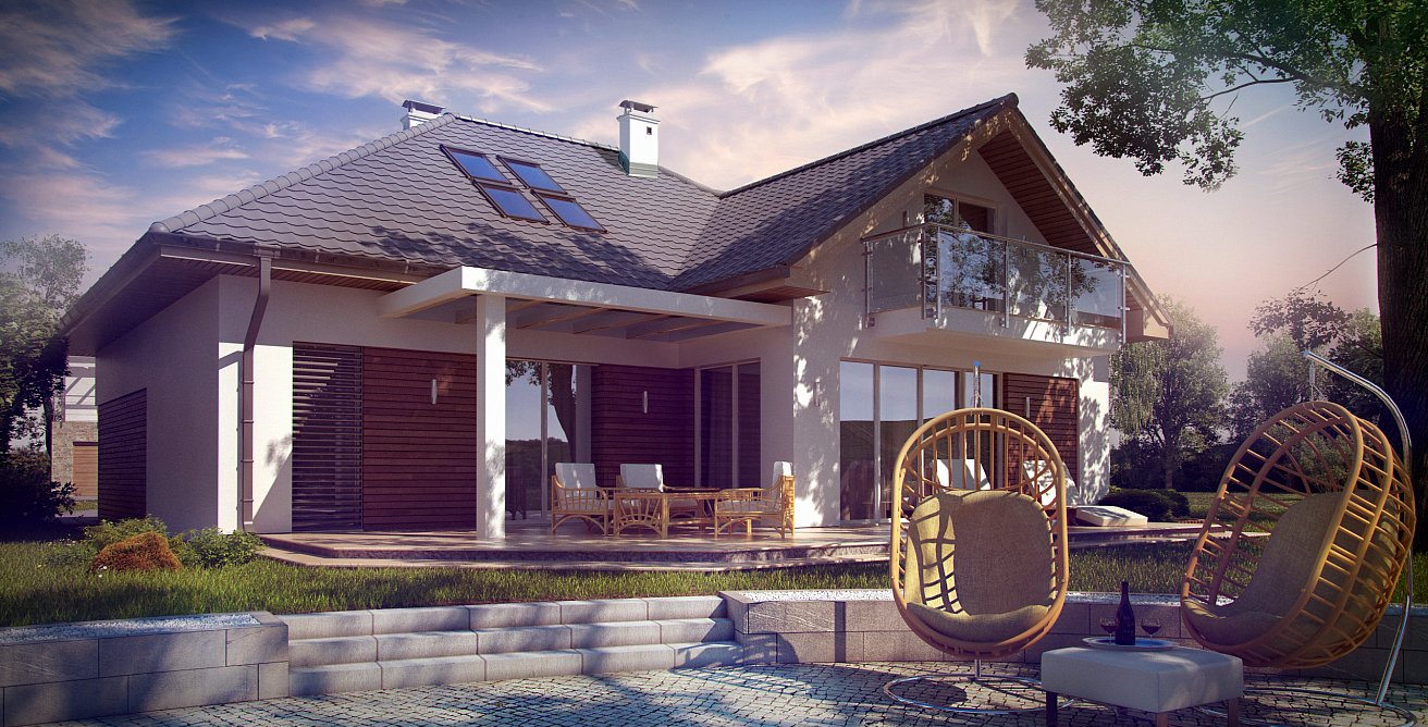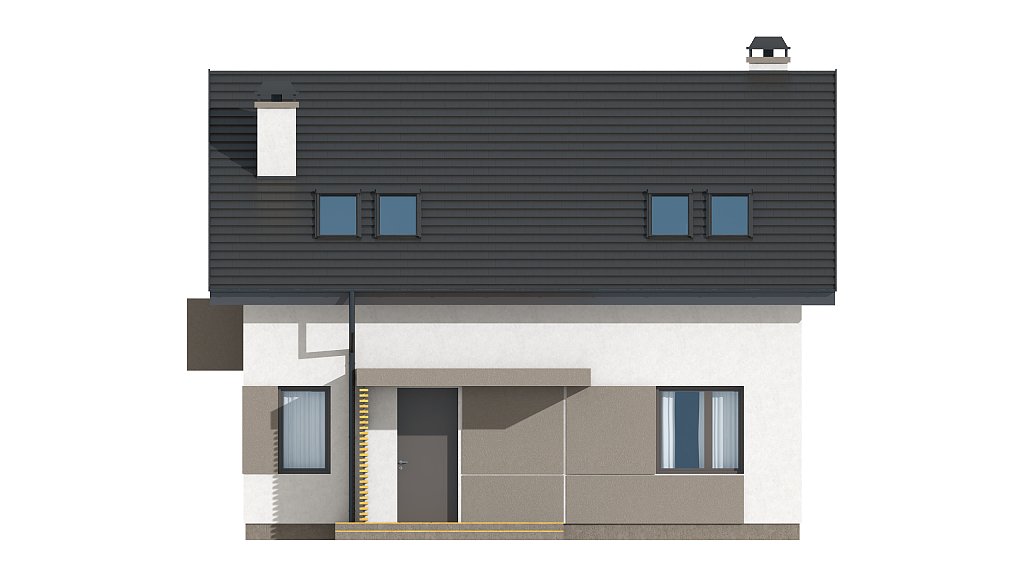 Проект практичного функционального дома современной отделкой фасада и дополнительной гостинной на мансарде.