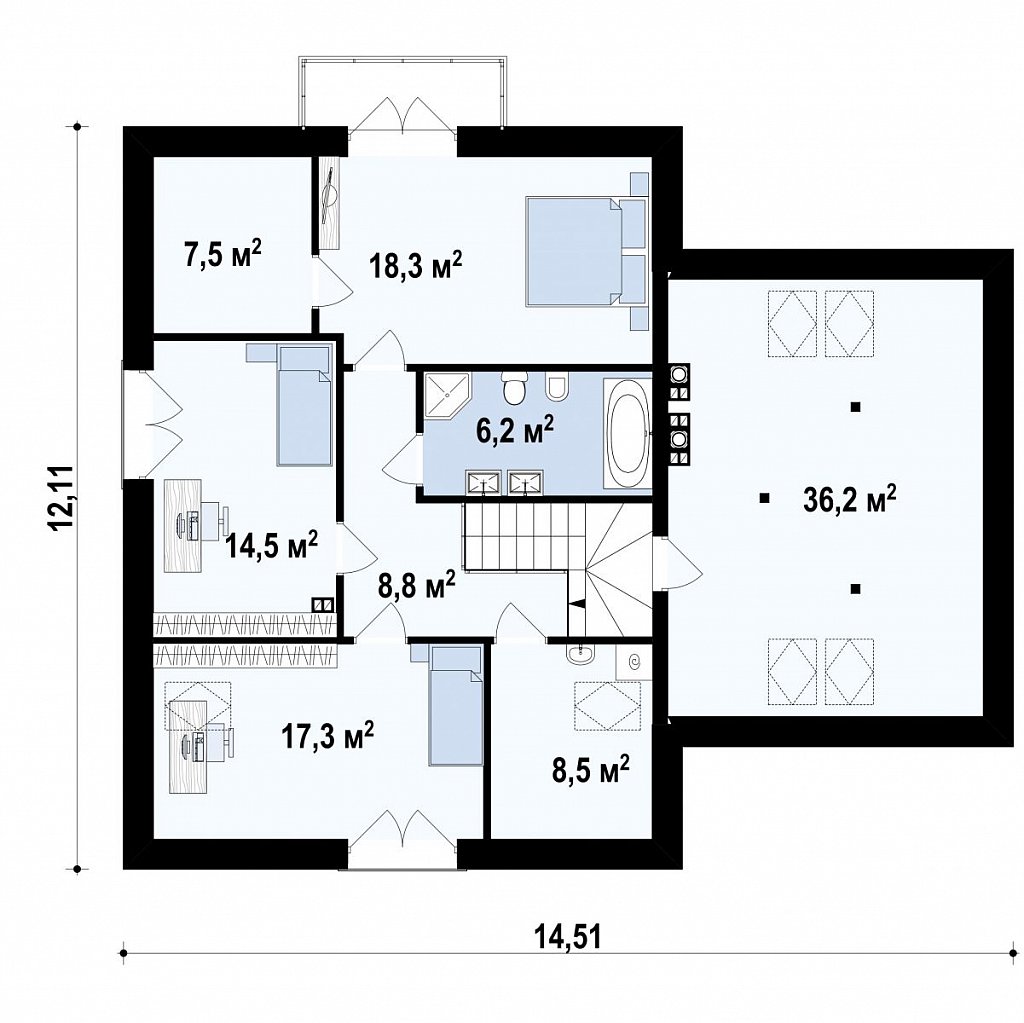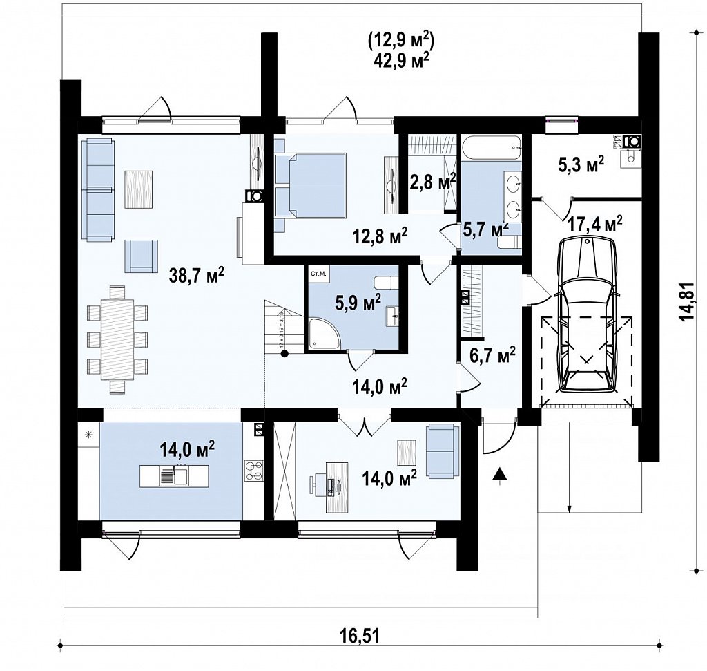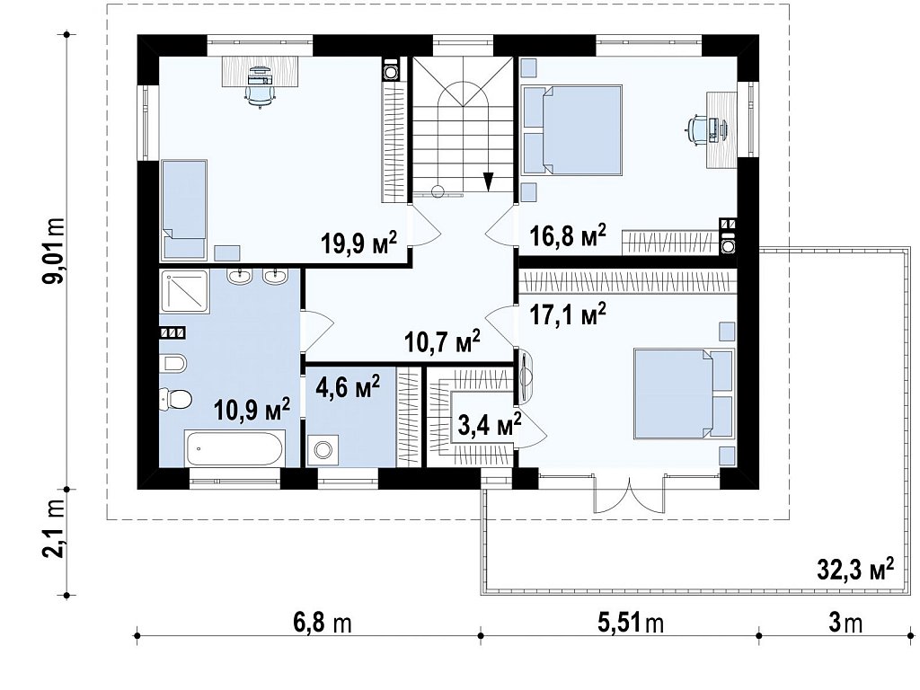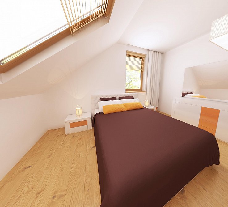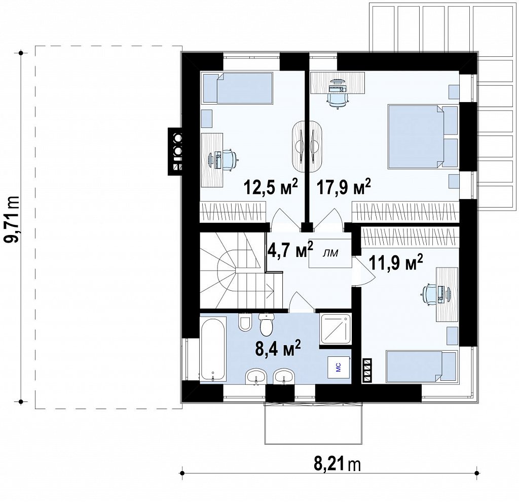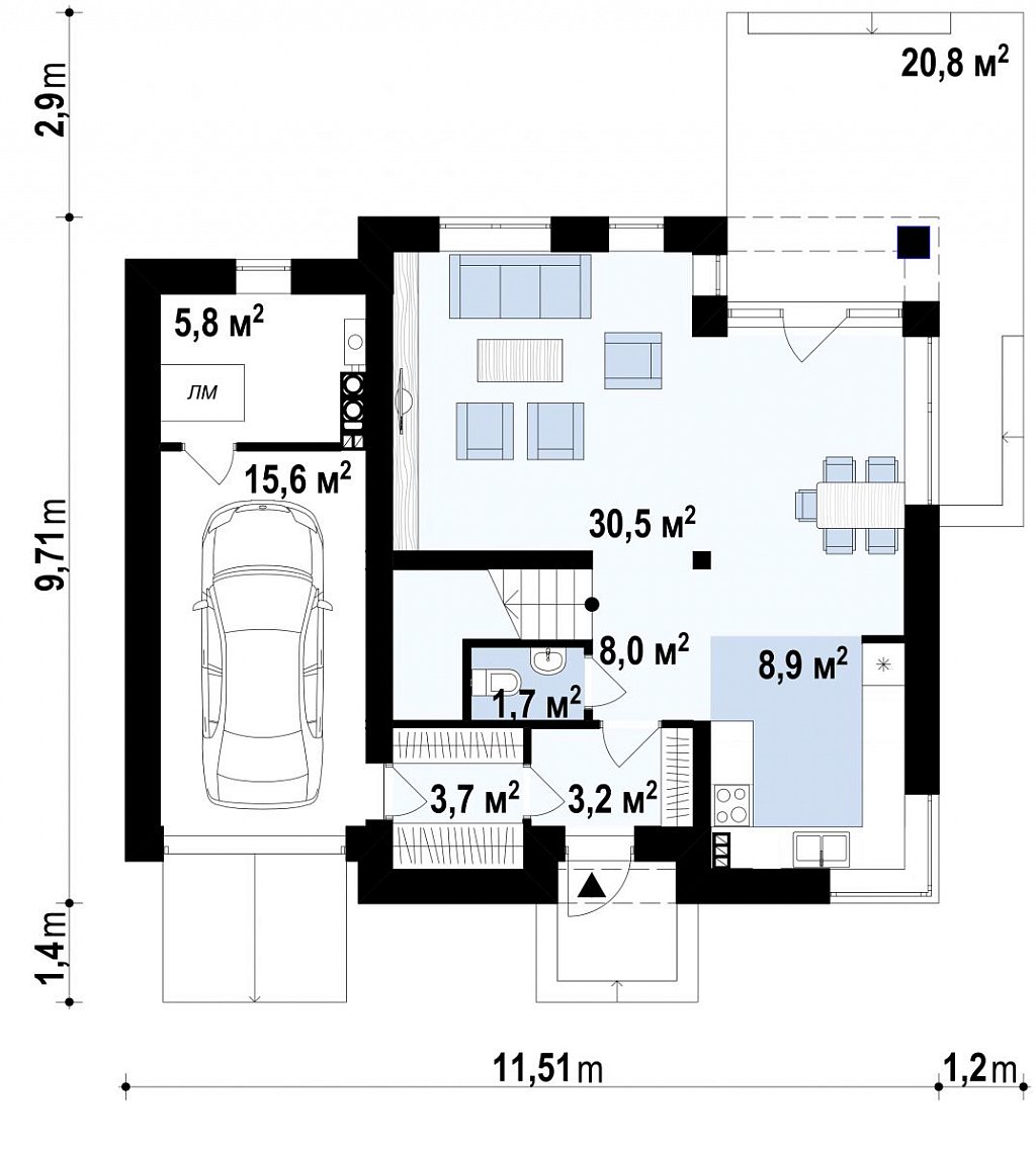 Проект практичного функционального дома современной отделкой фасада и дополнительной гостинной на мансарде.