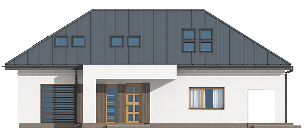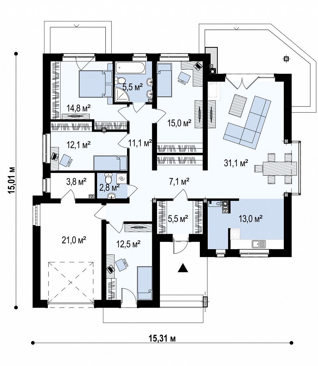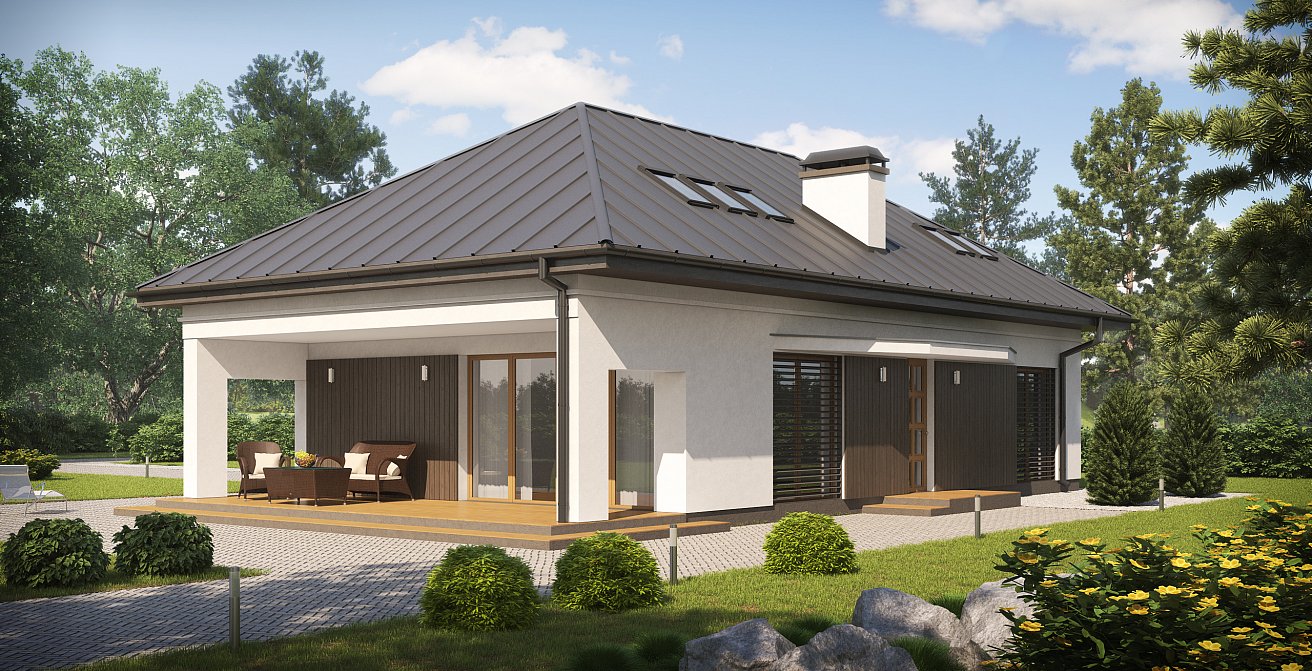Проект представляет собой просторный одноэтажный дом с многоскатной крышей, угловым окном и угловой террасой в дневной зоне