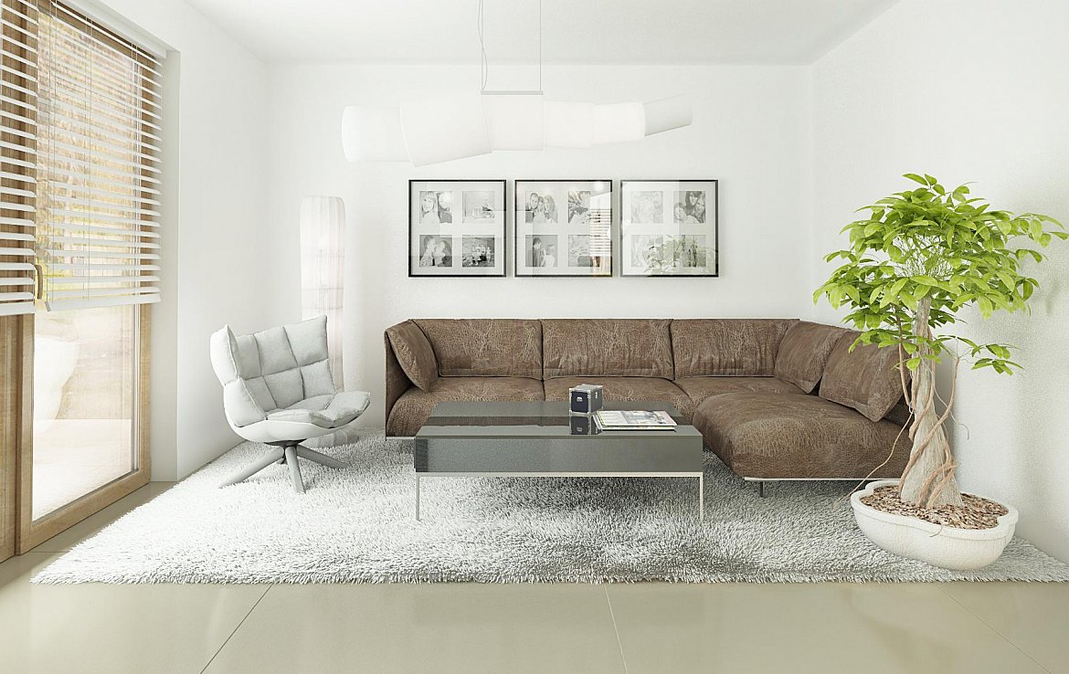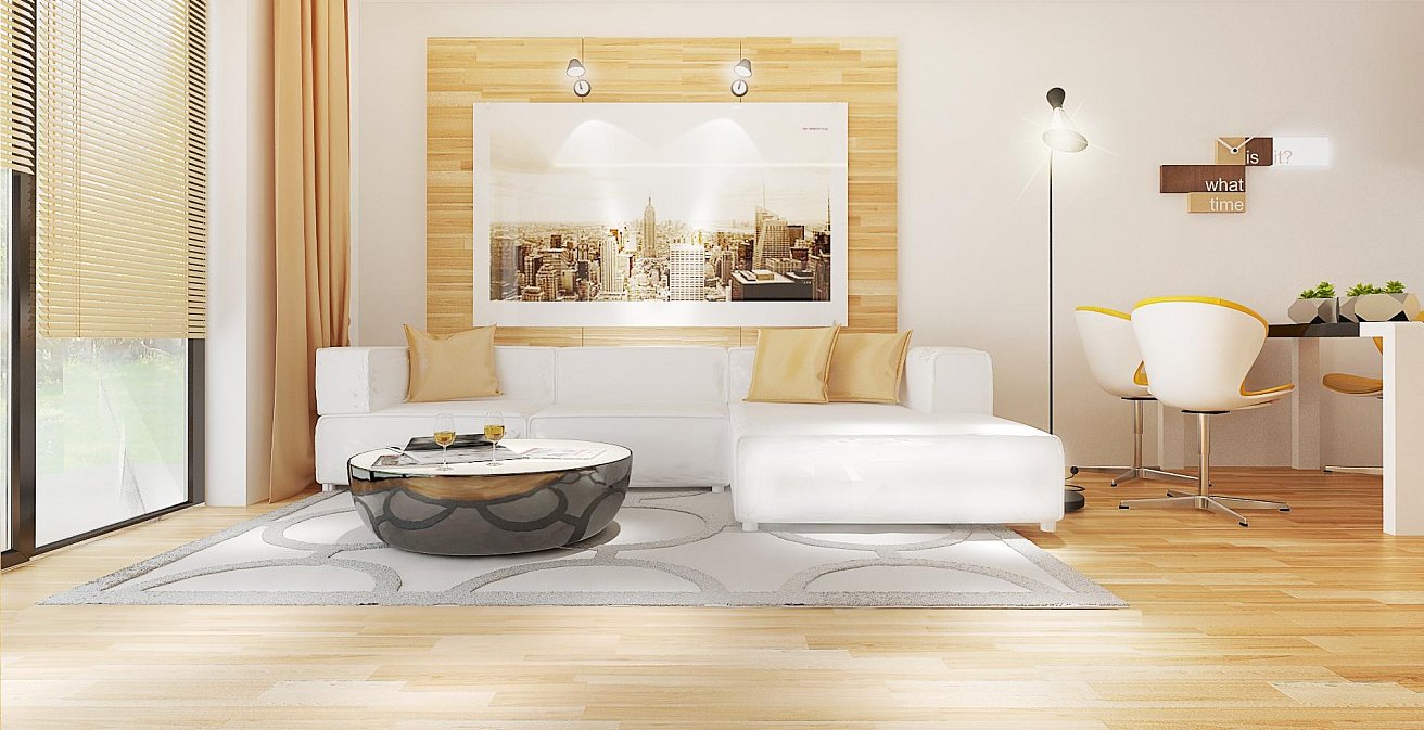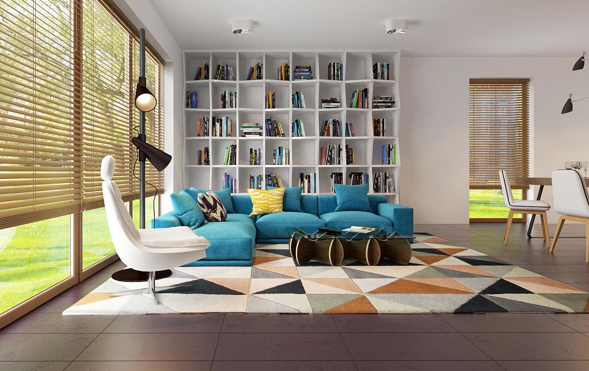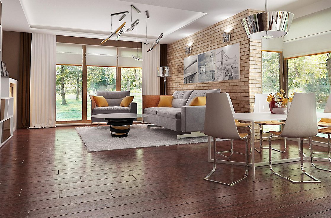 Просторный одноэтажный дом с многоскатной крышей, угловым окном и угловой террасой в дневной зоне.