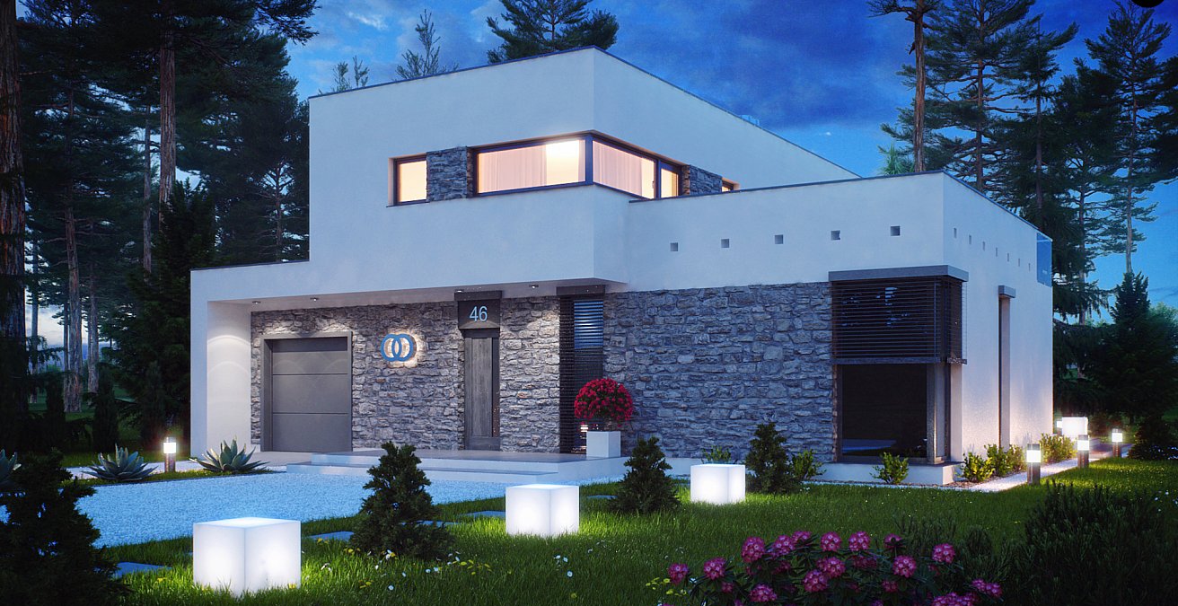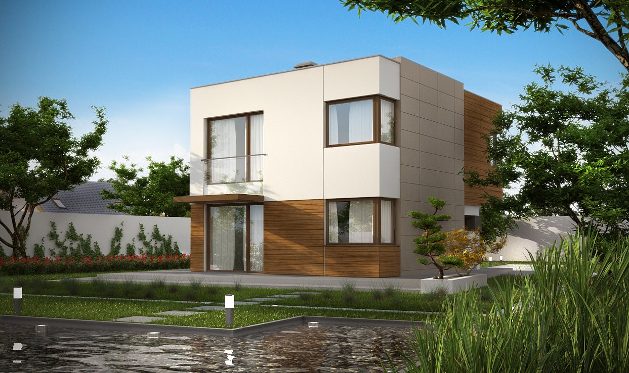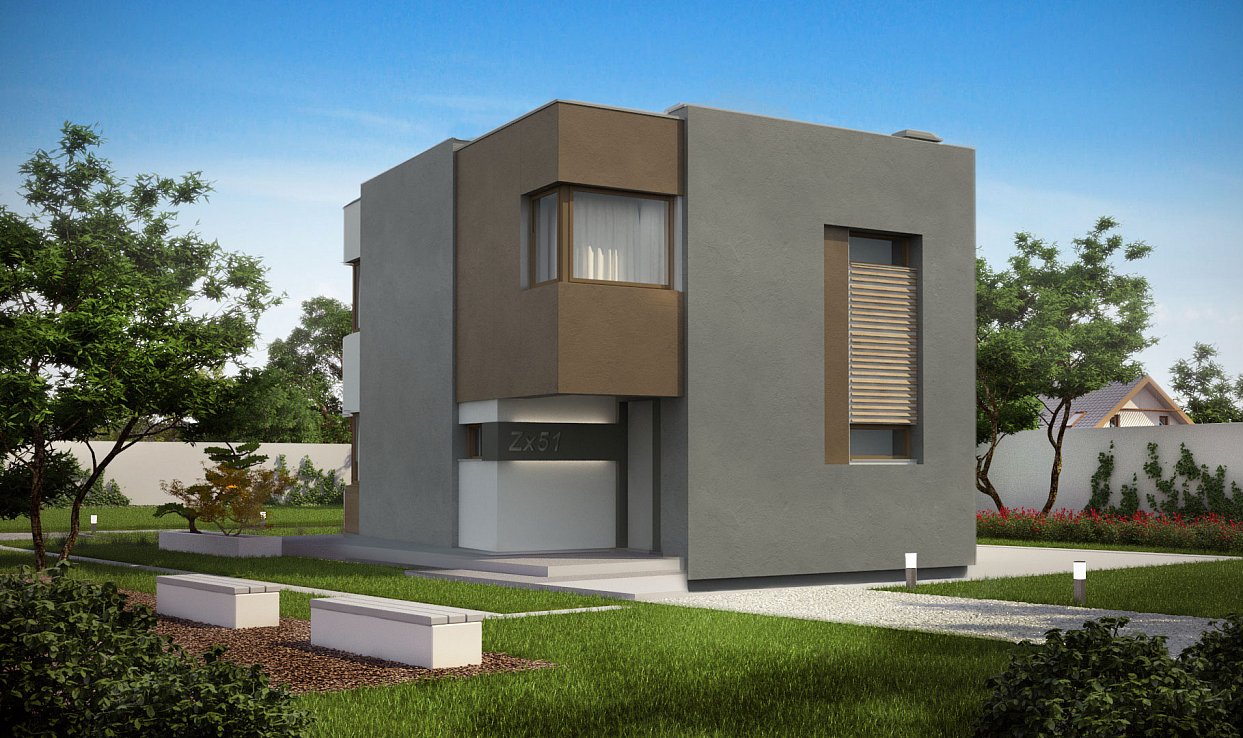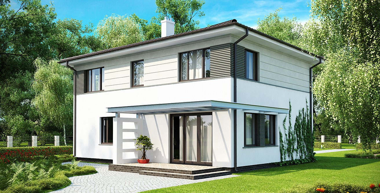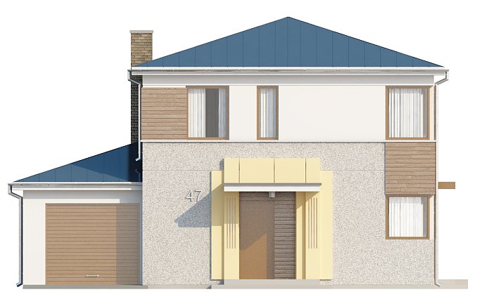 Проект представляет дом, сочетающий традиционные формы и современный дизайн, эта разработка с тремя спальнями и гаражом. За основу взята простая кубическая форма, экстерьер решён в современном стиле, что позволяет использовать проект как для городских, так и для загородных участков.