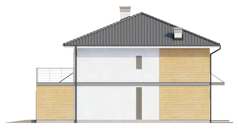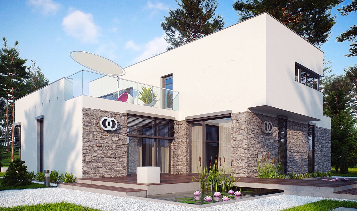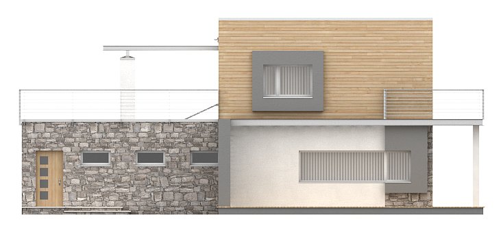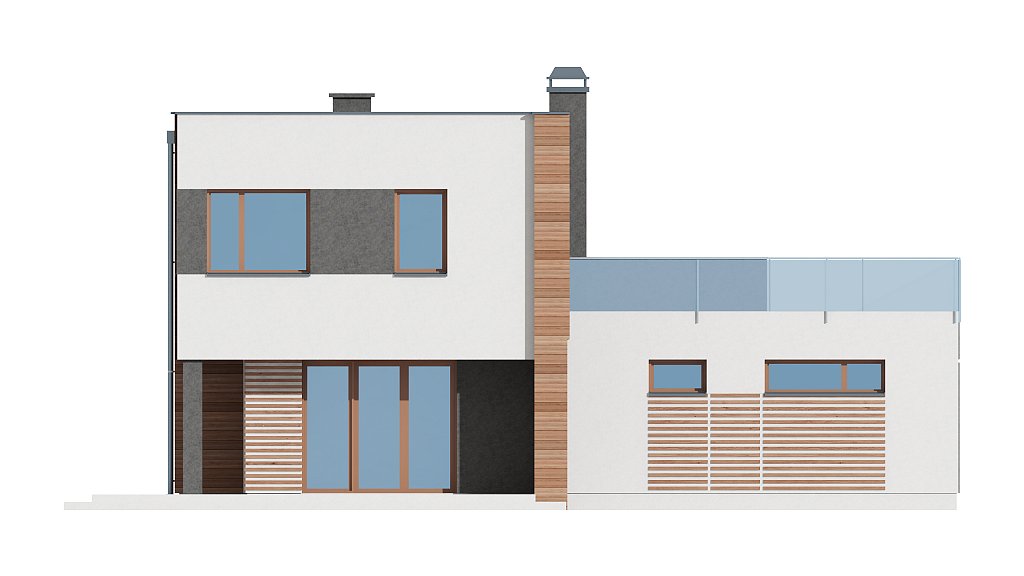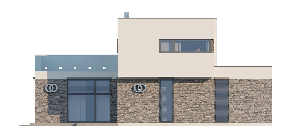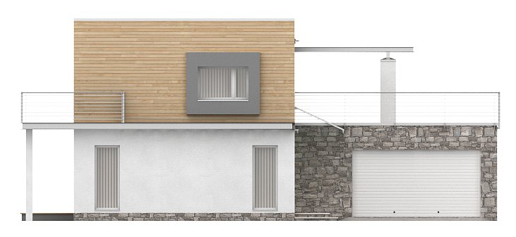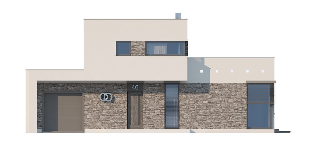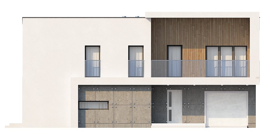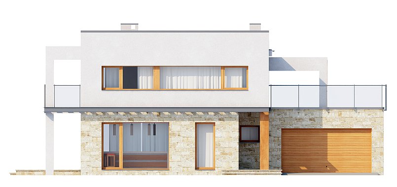 Проект представляет оригинальный дом в современном стиле с обширной террасой над гаражом. Он выполнен в строгом стиле и удачно сочетает лаконичность линий с оригинальным оформлением фасада, которое подчёркивают эркеры и крыша с низким углом наклона.