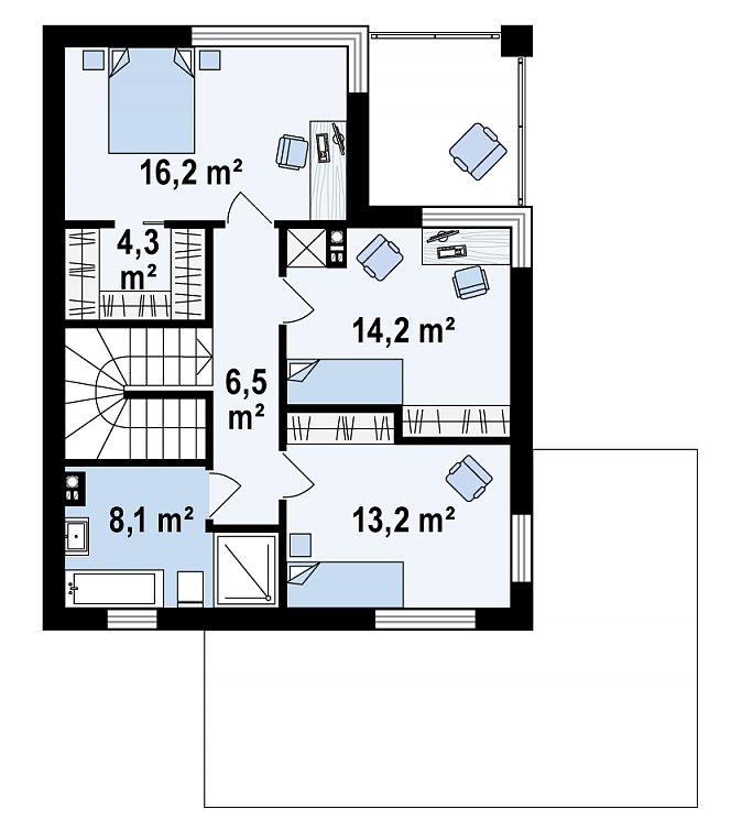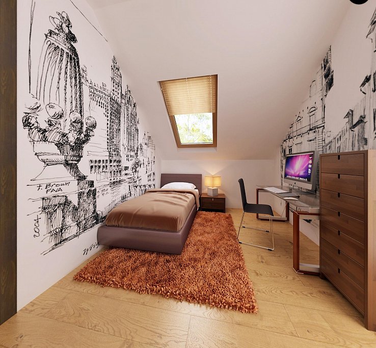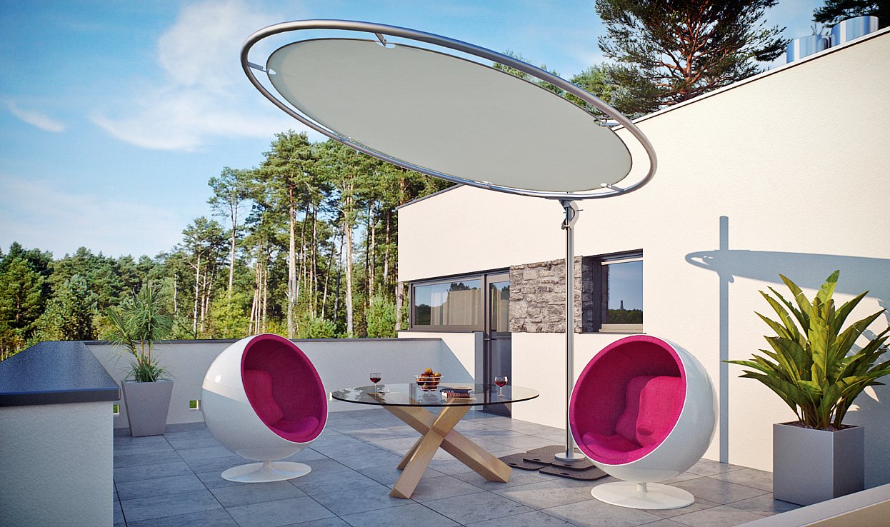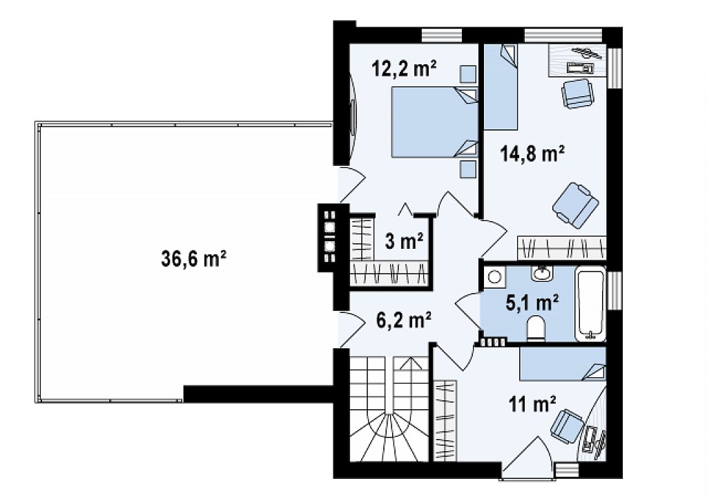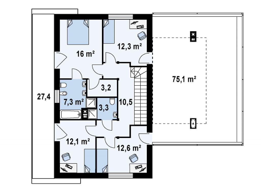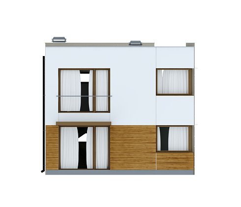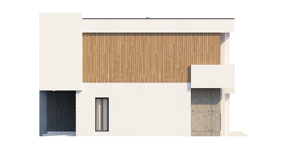 Проект представляет оригинальный дом в современном стиле с обширной террасой над гаражом. Он выполнен в строгом стиле и удачно сочетает лаконичность линий с оригинальным оформлением фасада, которое подчёркивают эркеры и крыша с низким углом наклона.