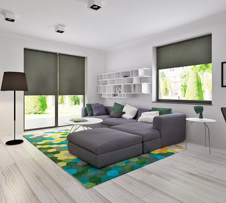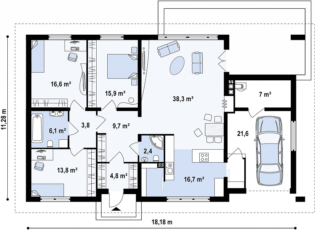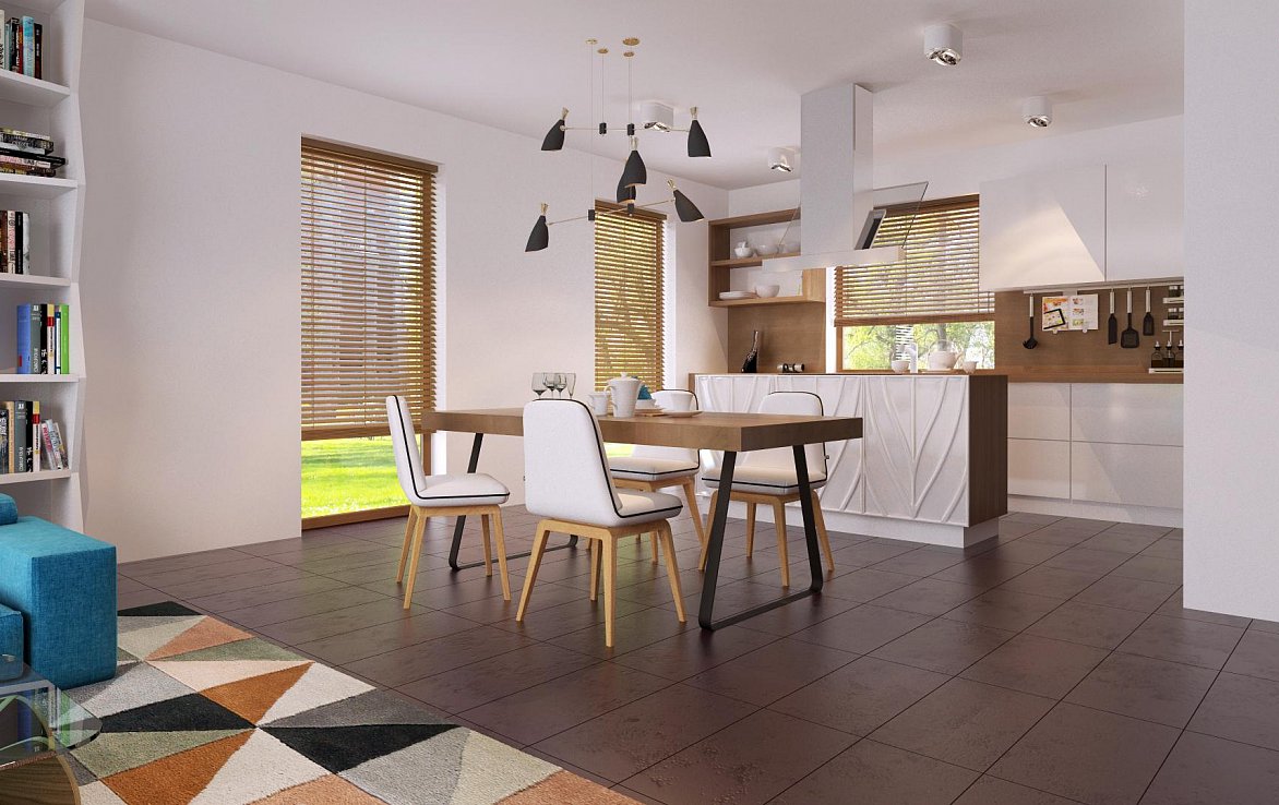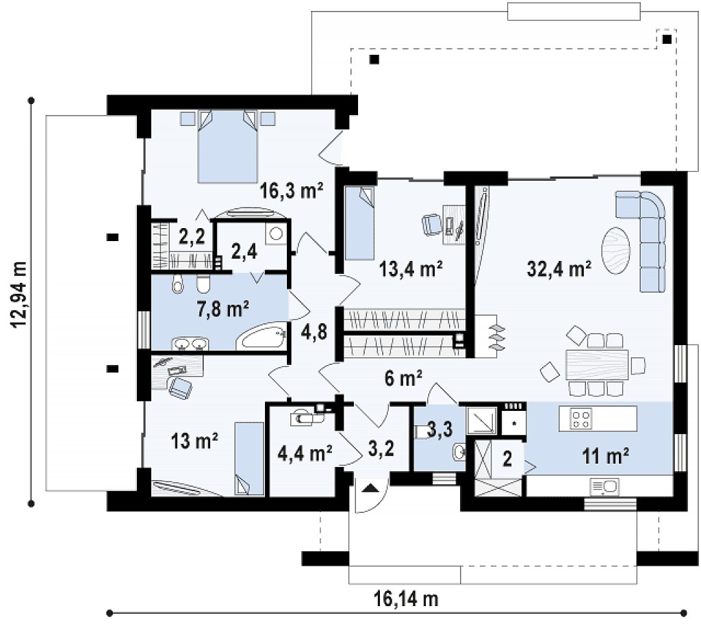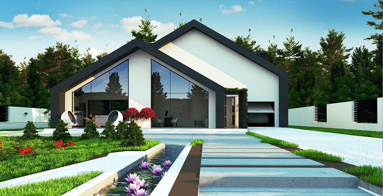 Практичный одноэтажный дом с четырьмя спальнями и гаражом отличается большой площадью остекления, функциональной и уютной планировкой.