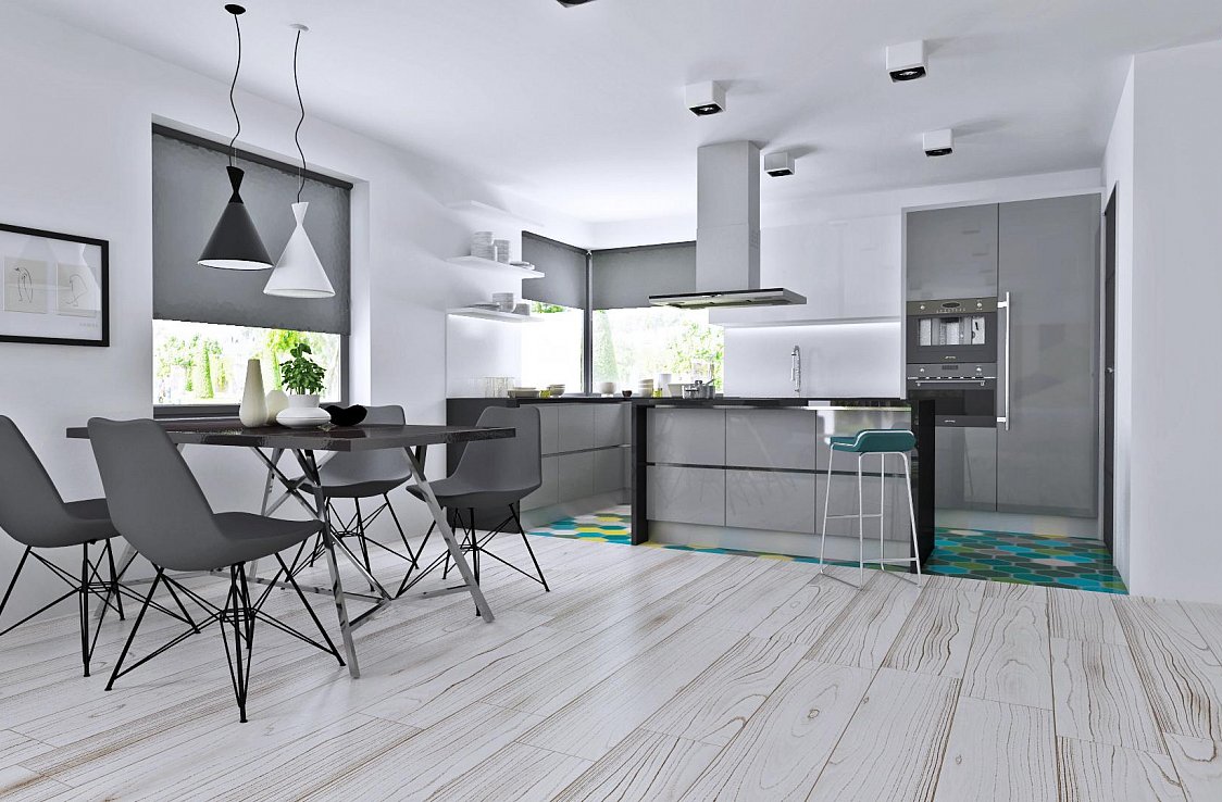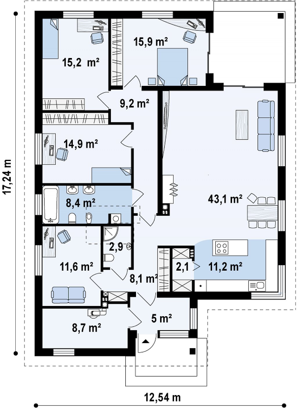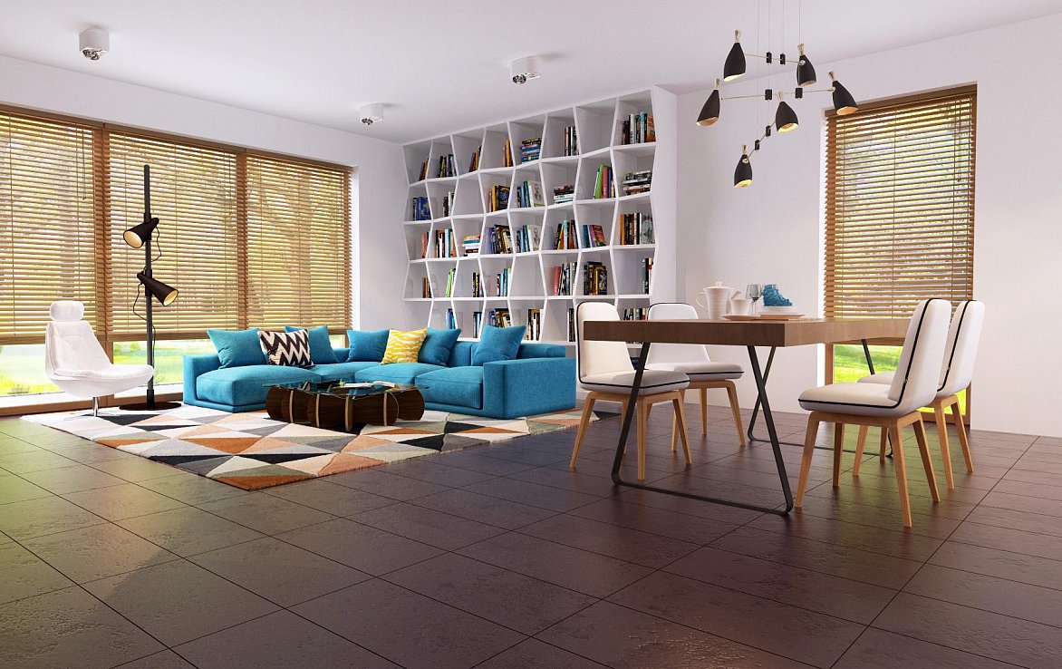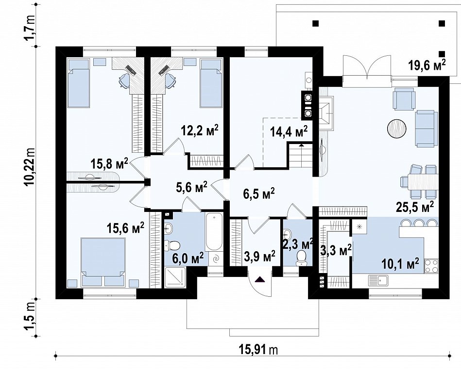 Практичный одноэтажный дом с четырьмя спальнями и гаражом отличается большой площадью остекления, функциональной и уютной планировкой.