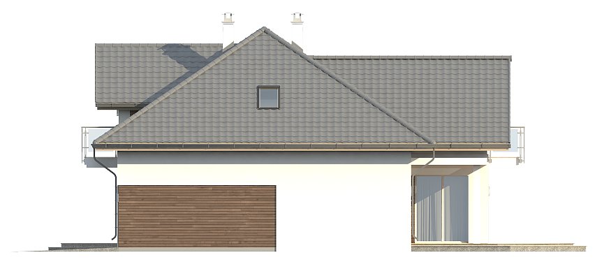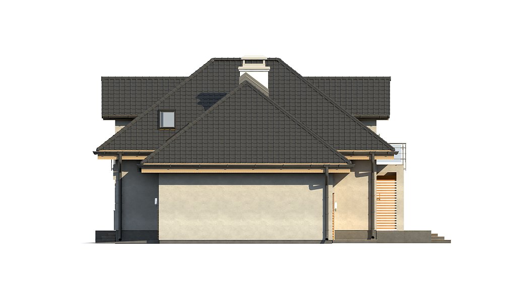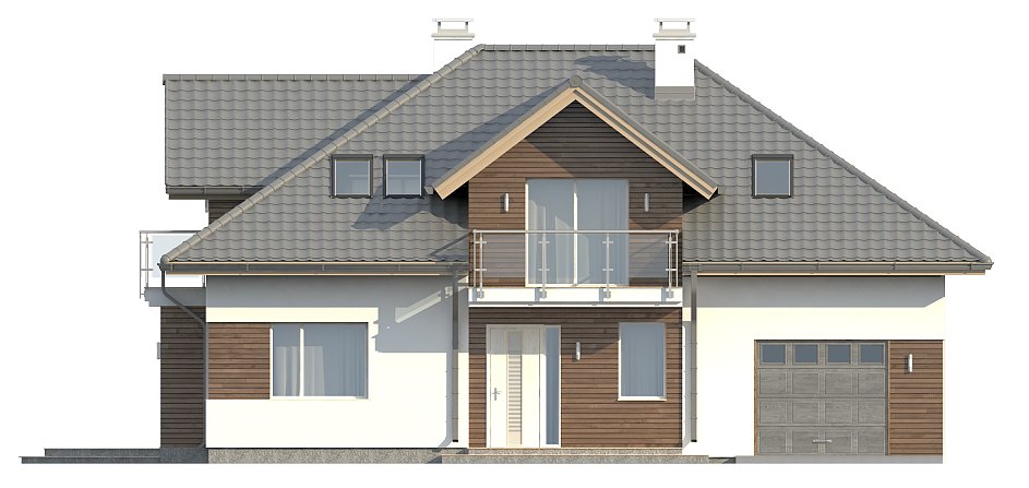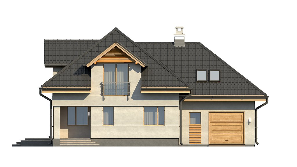 Практичный дом с гаражом, с красивым мансардным окном и боковой террасой.