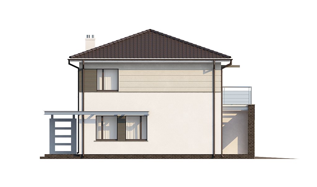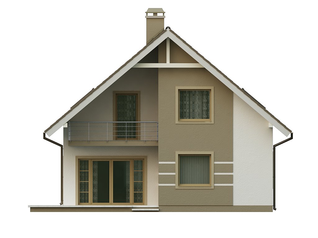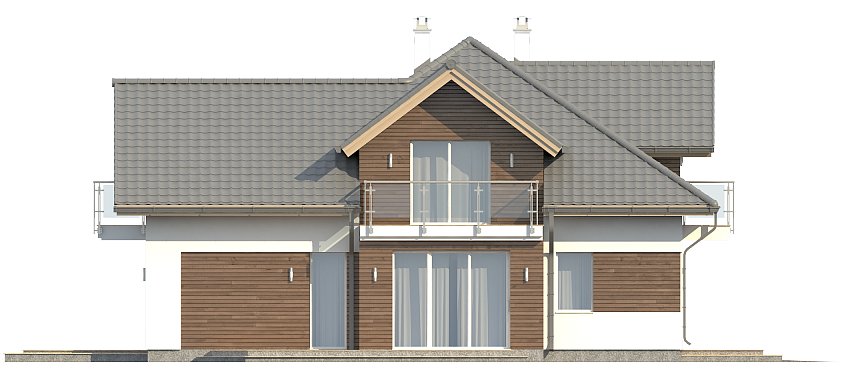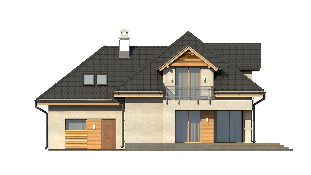 Данный проект представляет собой стильный дом с мансардой, экономичный в строительстве и эксплуатации. Несмотря на простую форму и двускатную крышу, данный дом выглядит современно и привлекательно благодаря красивому балкону над террасой, лаконичным элементам отделки фасадов и благородной цветной гамме.