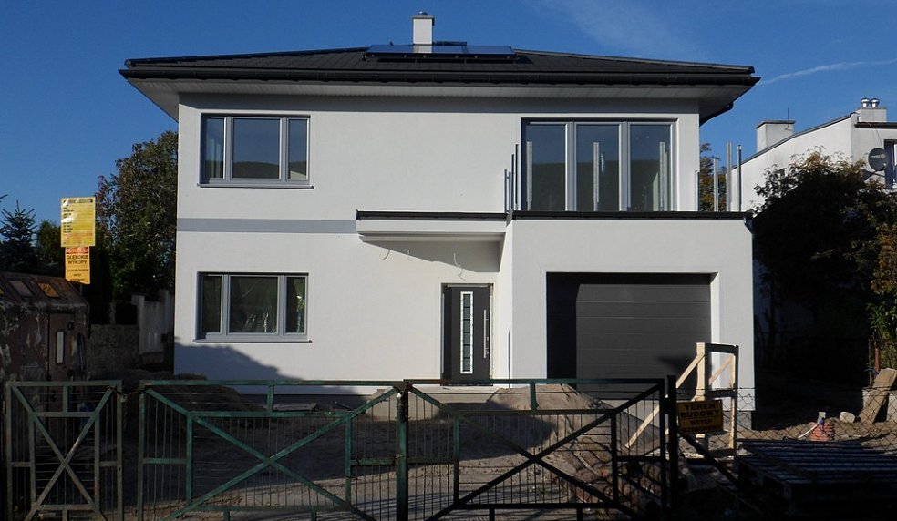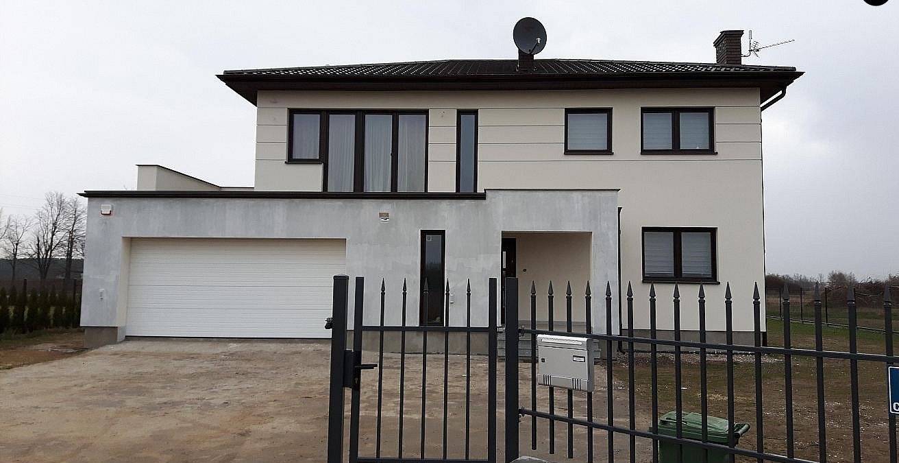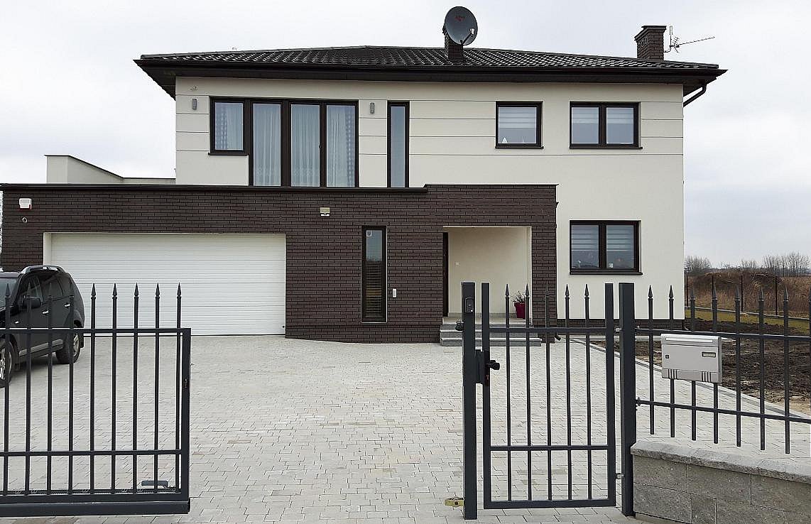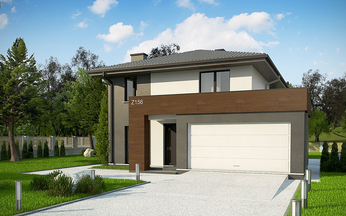 Двухэтажный дом с гаражом, сочетающий традиционные формы и современный дизайн