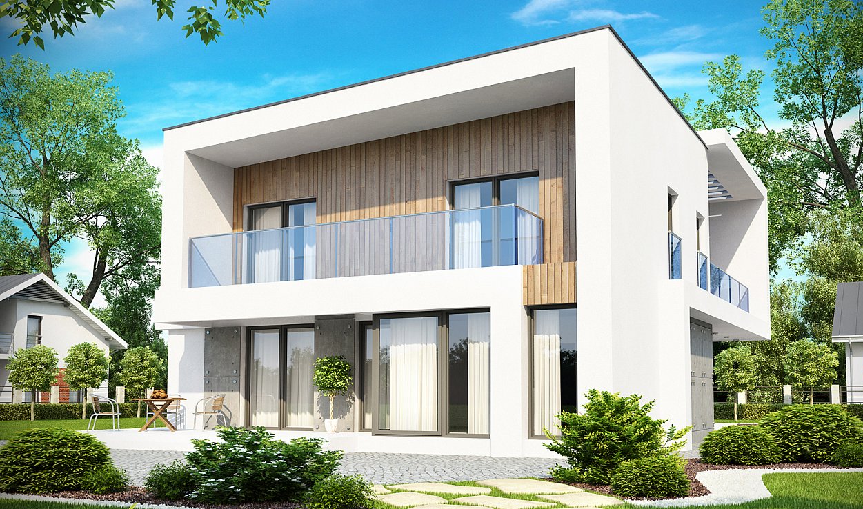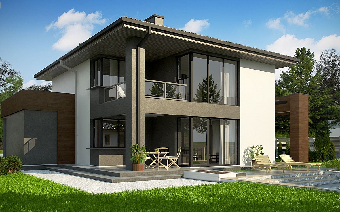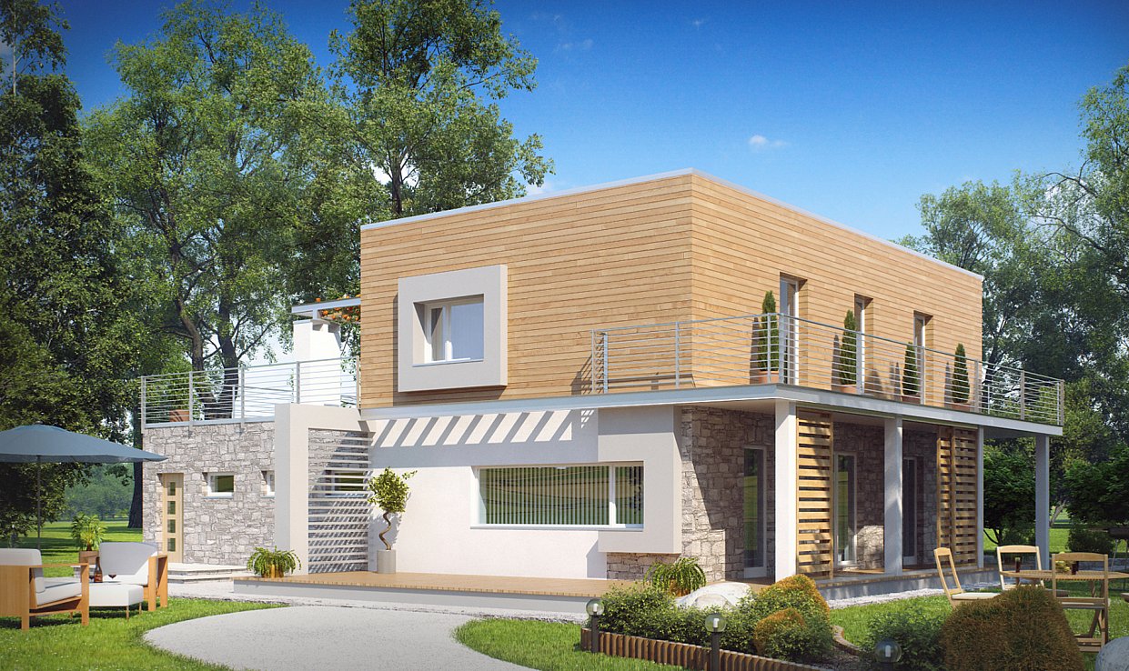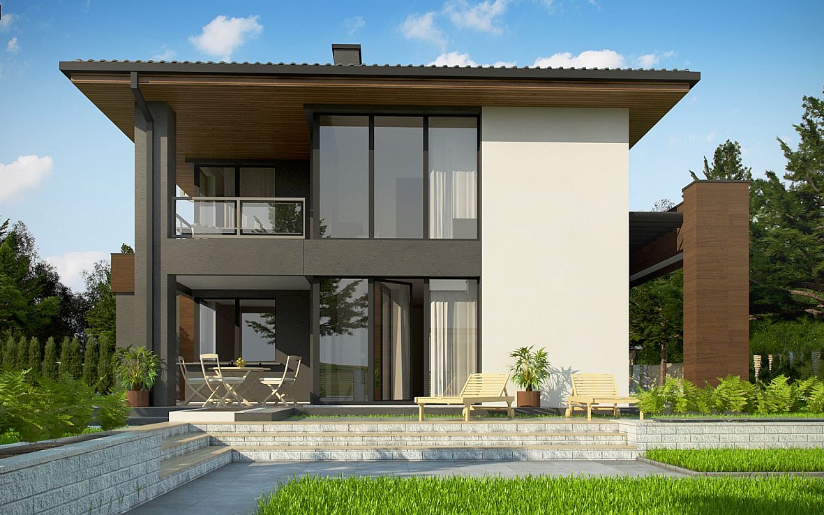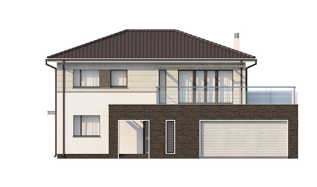 Практичный и уютный двухэтажный дом в современном стиле с обширной террасой над гаражом.