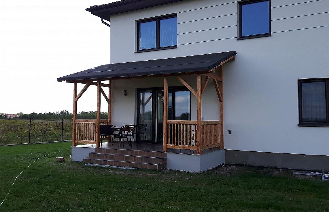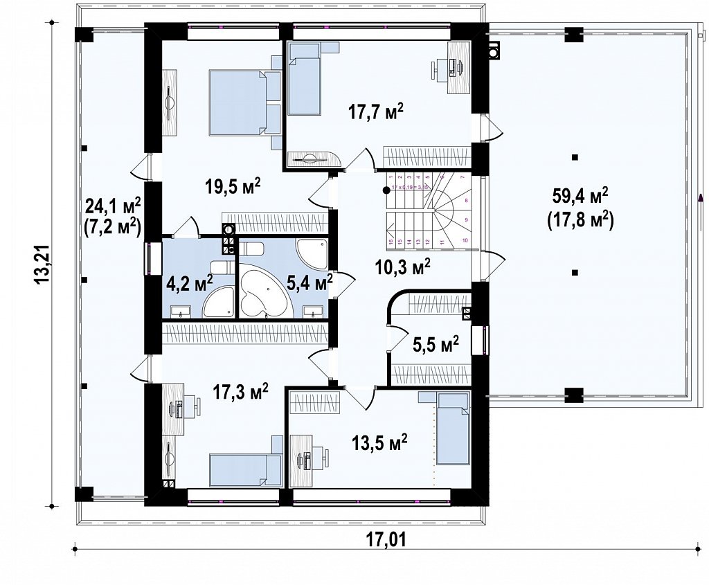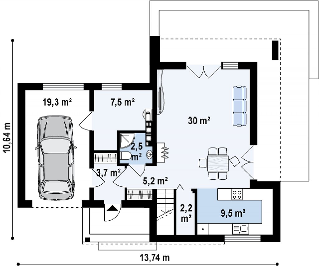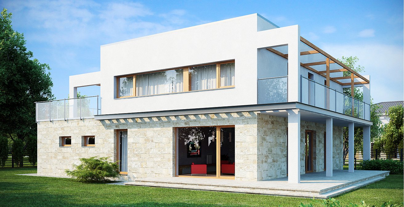 Практичный и уютный двухэтажный дом в современном стиле с обширной террасой над гаражом.
