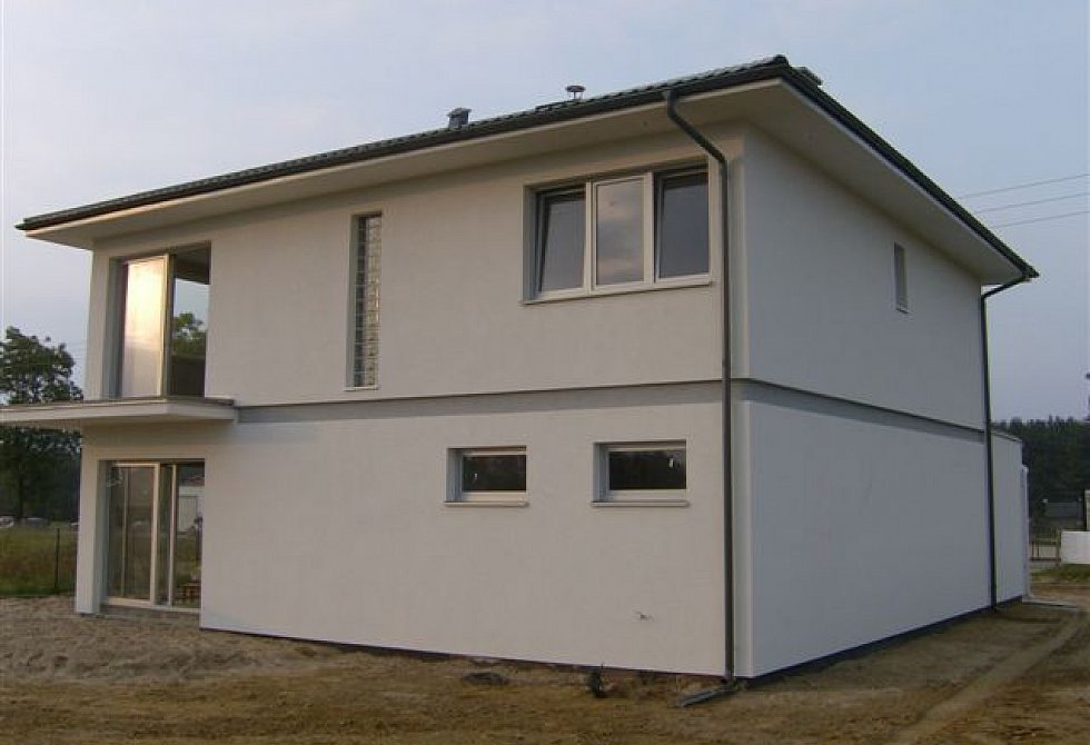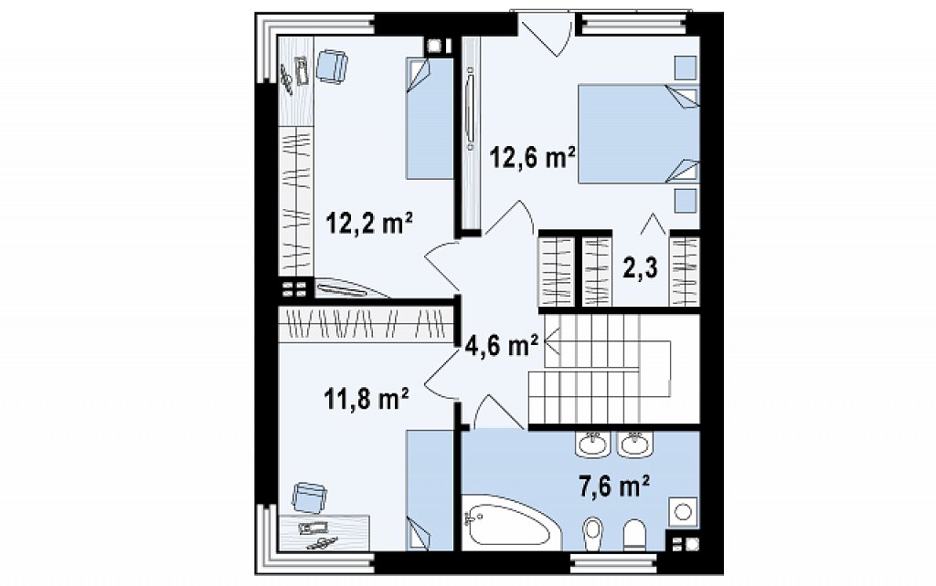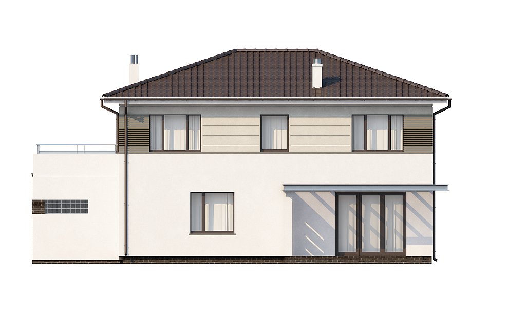 Комфортабельный дом с двумя полноценными этажами, выстроенный по данному проекту, придется по нраву сторонникам современного архитектурного стиля.