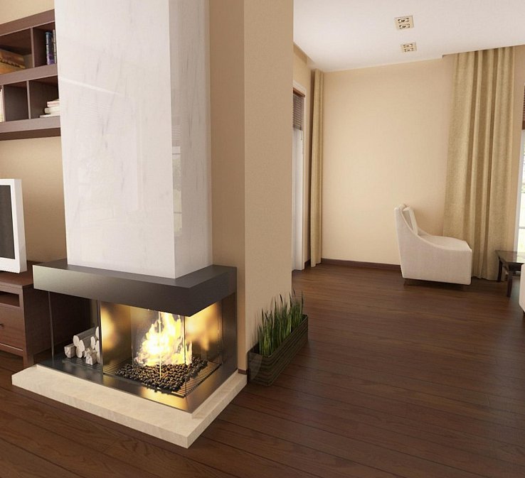 Данный проект представляет собой красивый и удобный одноэтажный дом с многоскатной кровлей, эркером и камином на террасе. Его внешний традиционный архитектурный стиль прекрасно сочетается с современной практичной планировкой интерьера.