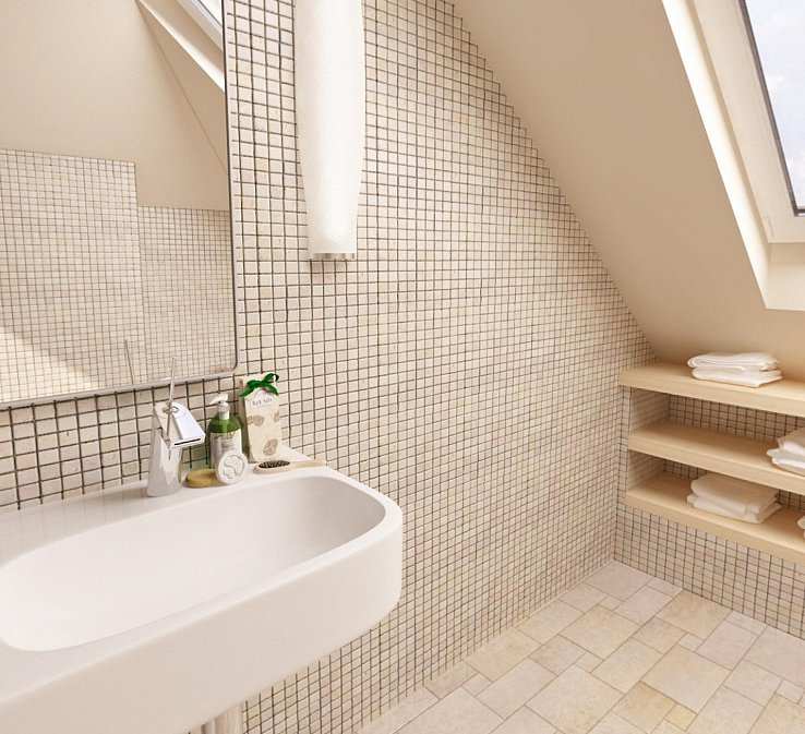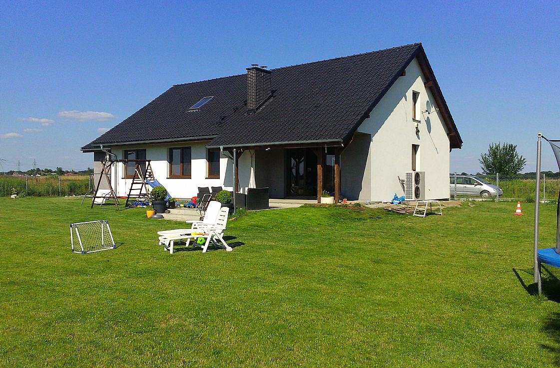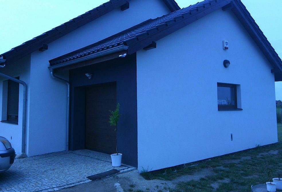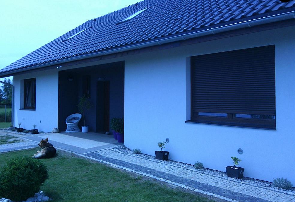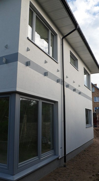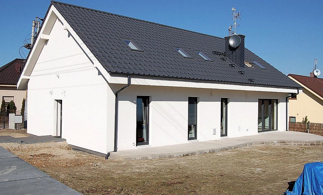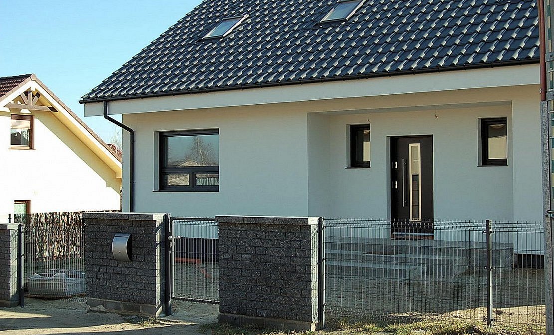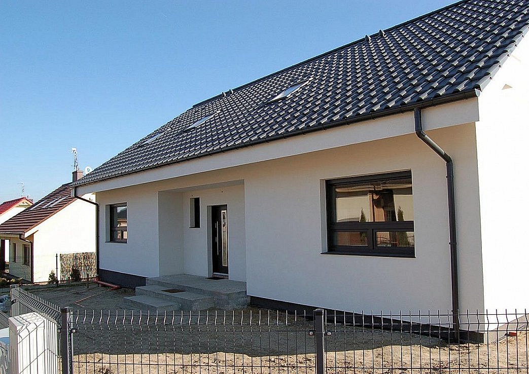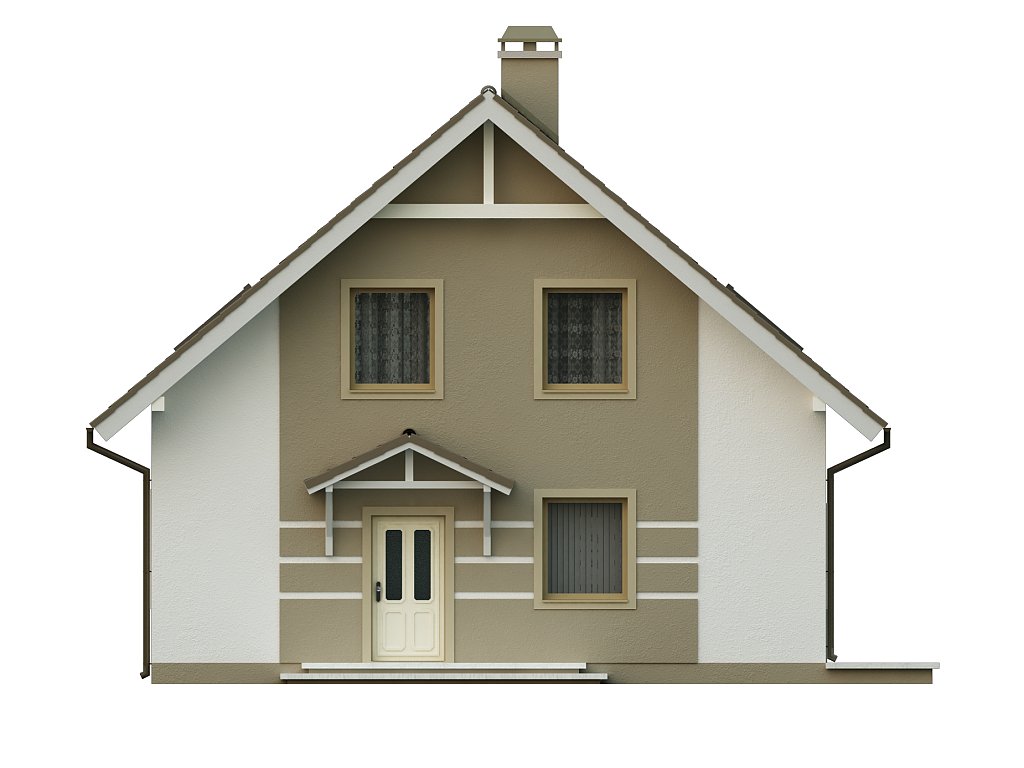 Небольшой стильный и практичный дом традиционной формы с треугольными мансардными окнами, простой и элегантной отделкой фасадов.