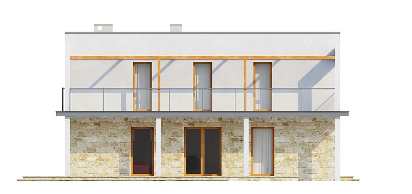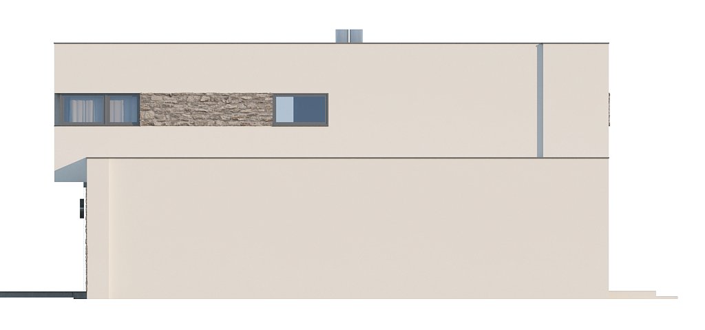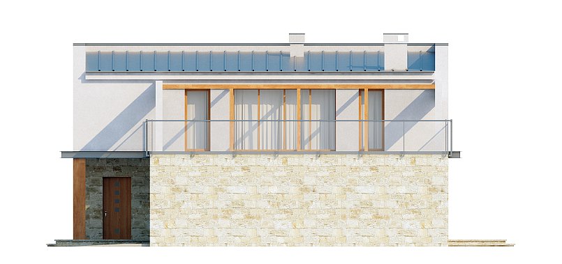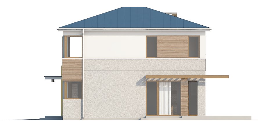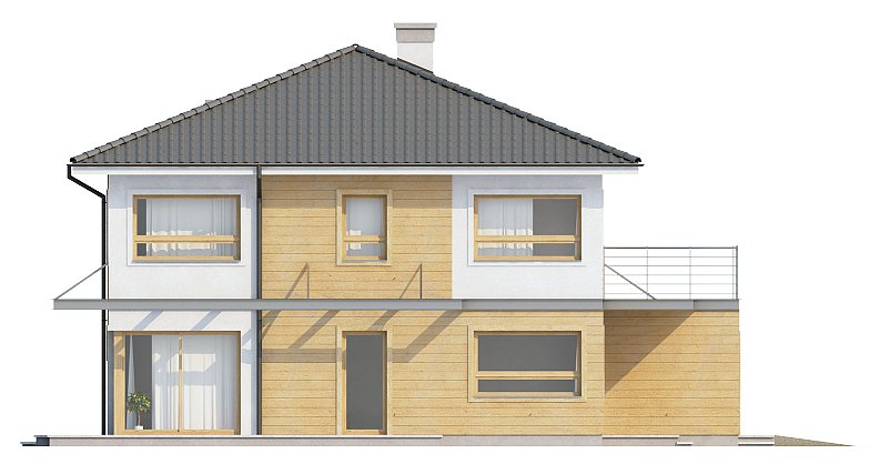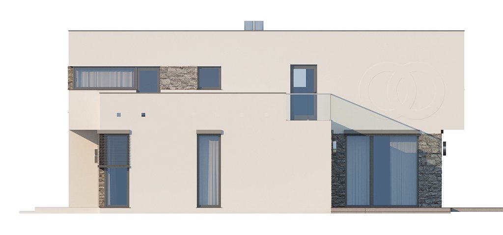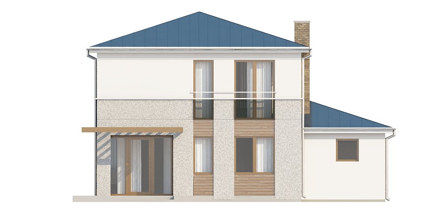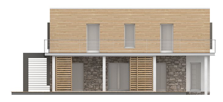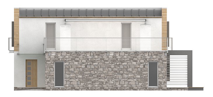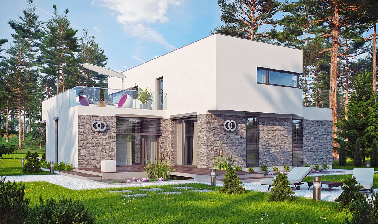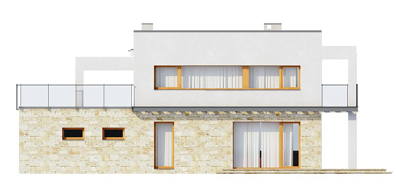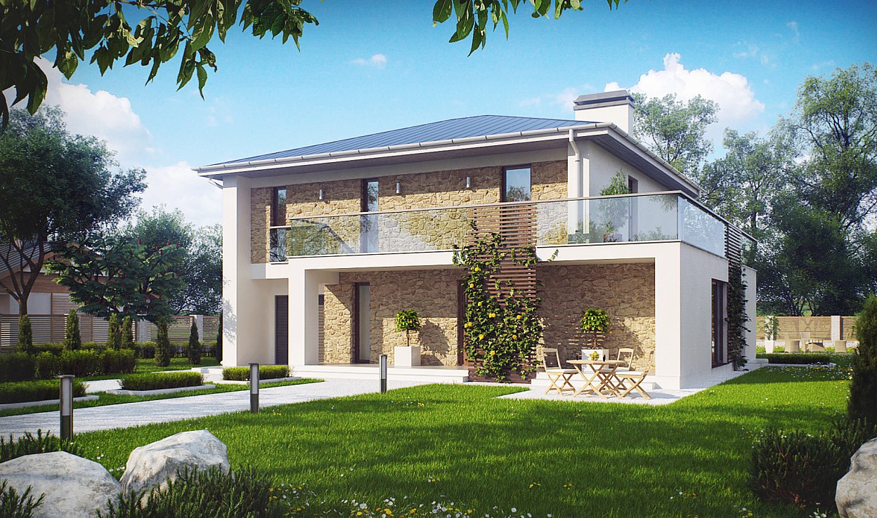 Проект представляет просторный и комфортный двухэтажный дом с большими окнами. Респектабельный облик фасада подчёркнут отделкой натуральным камнем и стильным оформлением зоны террасы с помощью поперечных панелей тёмного дерева