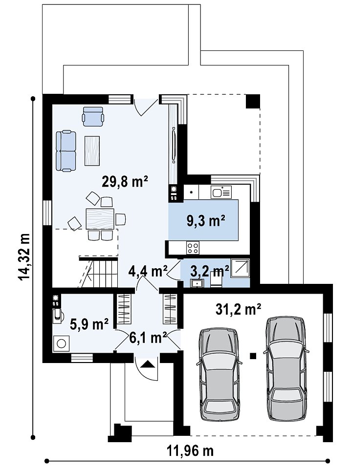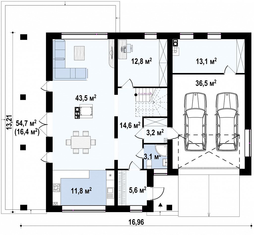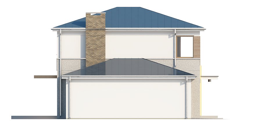 Проект представляет просторный двухэтажный дом с удлинённым гаражом для двух автомобилей.