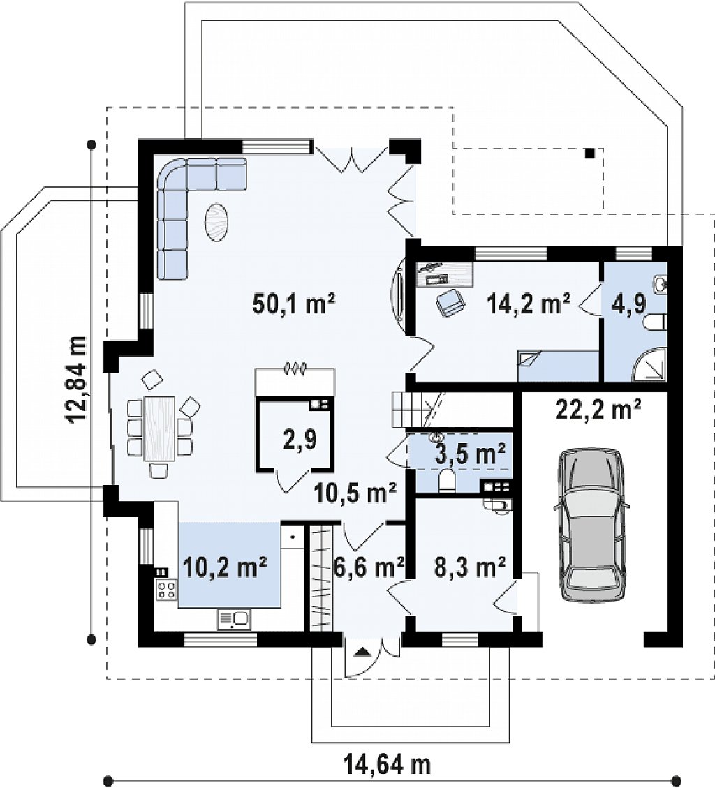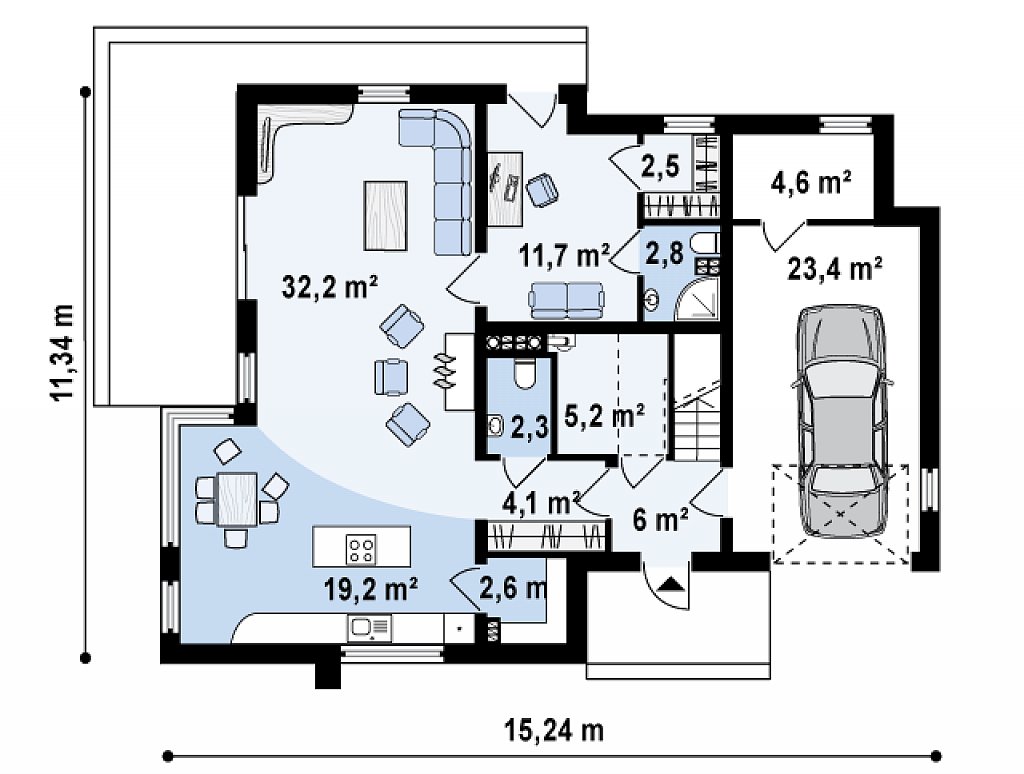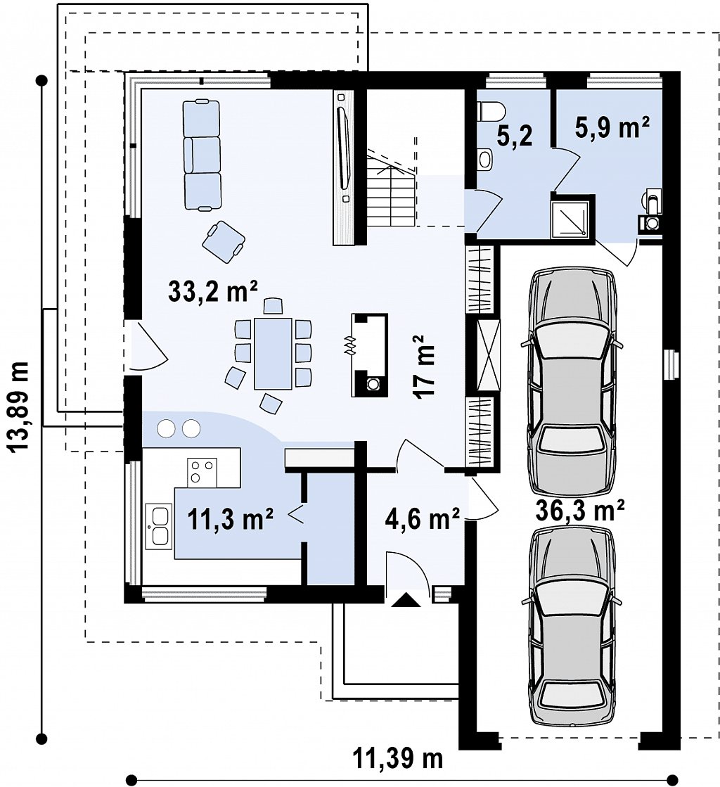 Дом "L"-образной формы с гаражом и красивым фасадным окном, созданный в традиционном стиле. Дом предназначен для тех, кто наряду с безупречной функциональностью каждого помещения ценит элегантный внешний вид.
