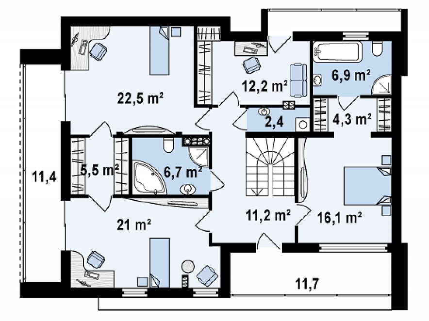 Проект предназначен для большой семьи, каждый член которой в этом доме будет чувствовать себя удобно и свободно.